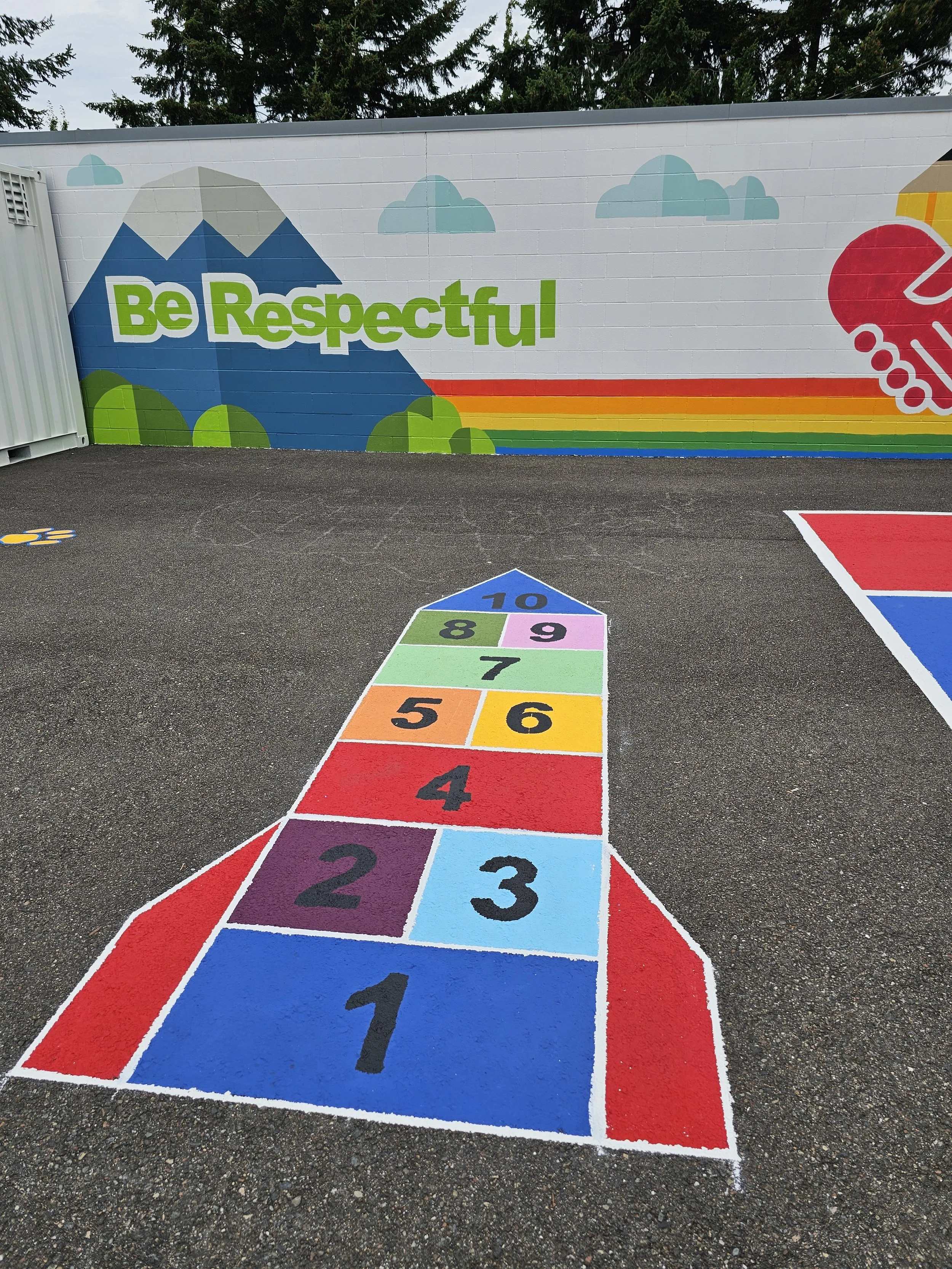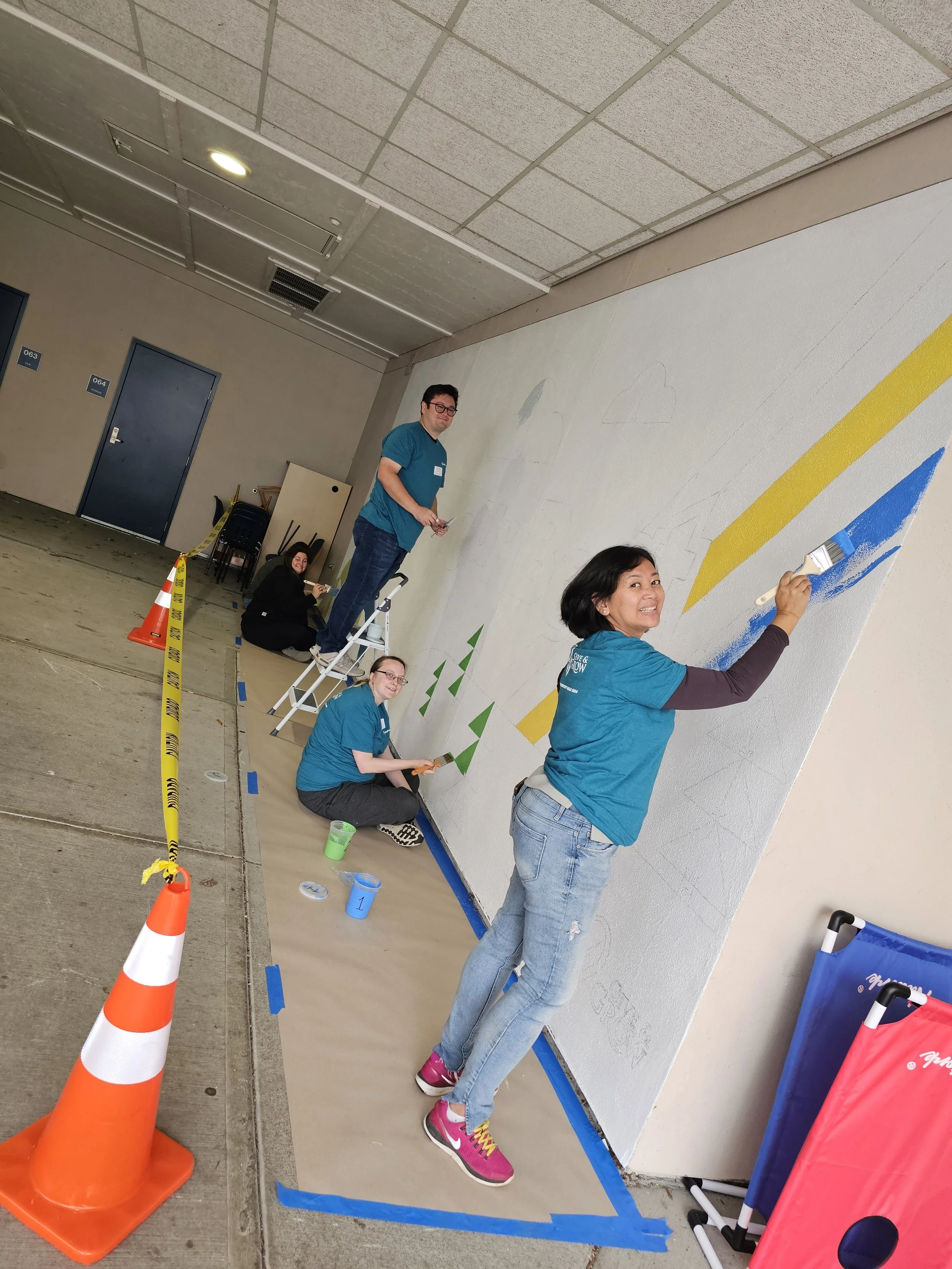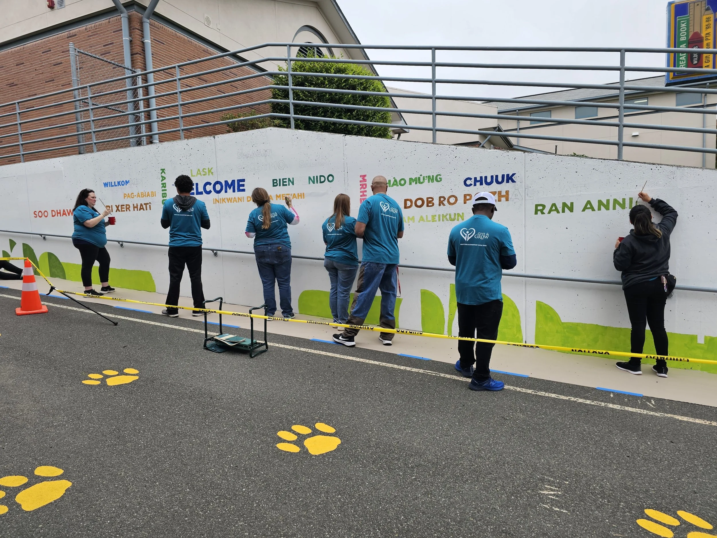 The 2024 Create Event was at Whitter Elementary School. Over 80 employees of Safran Cabin and their family members volunteered to bring bright colors to the playground. The volunteers painted multiple wall murals, the playground sports court, add a rainbow on the playground staircase, and paint a welcome mural in multiple languages.