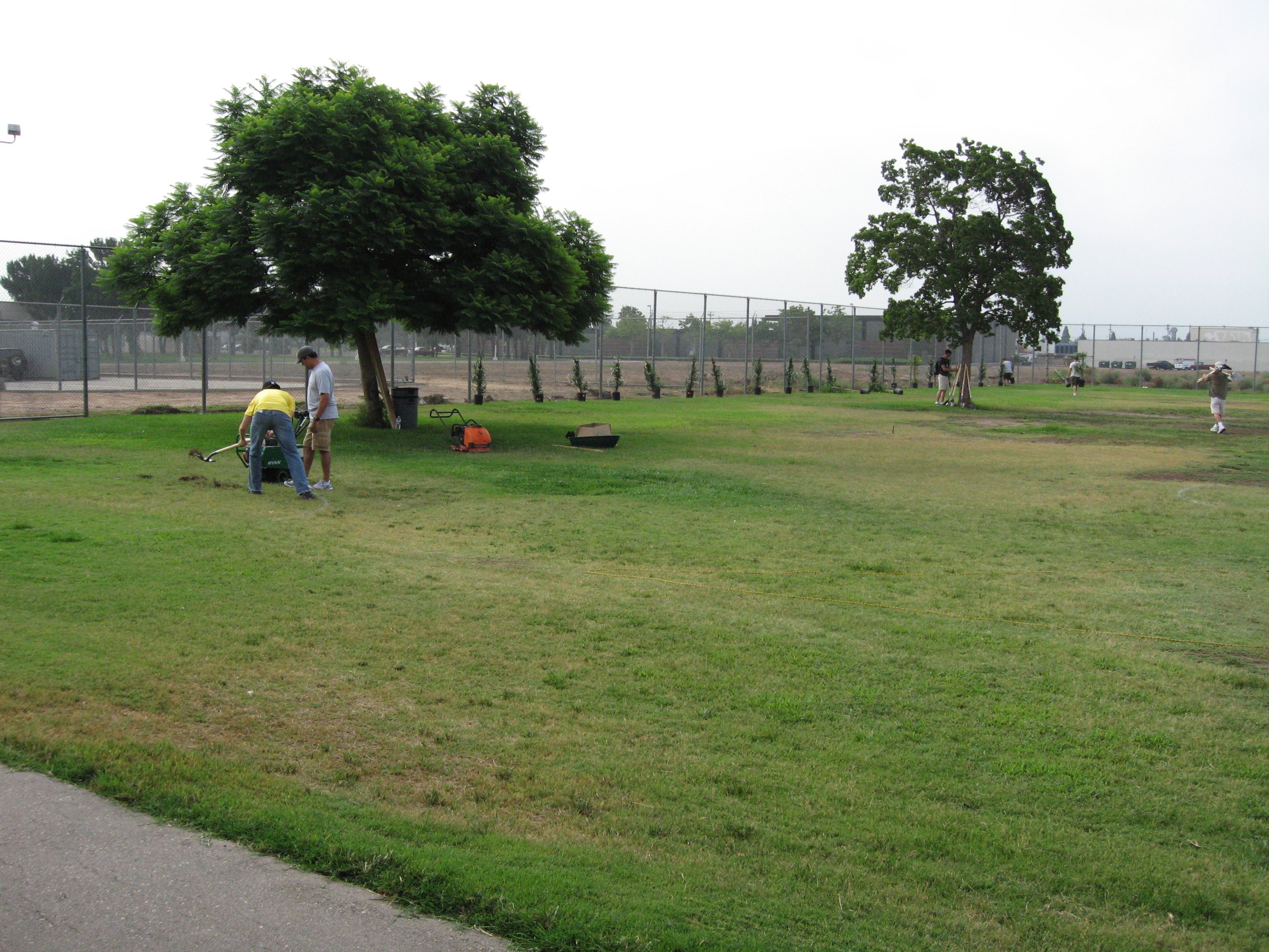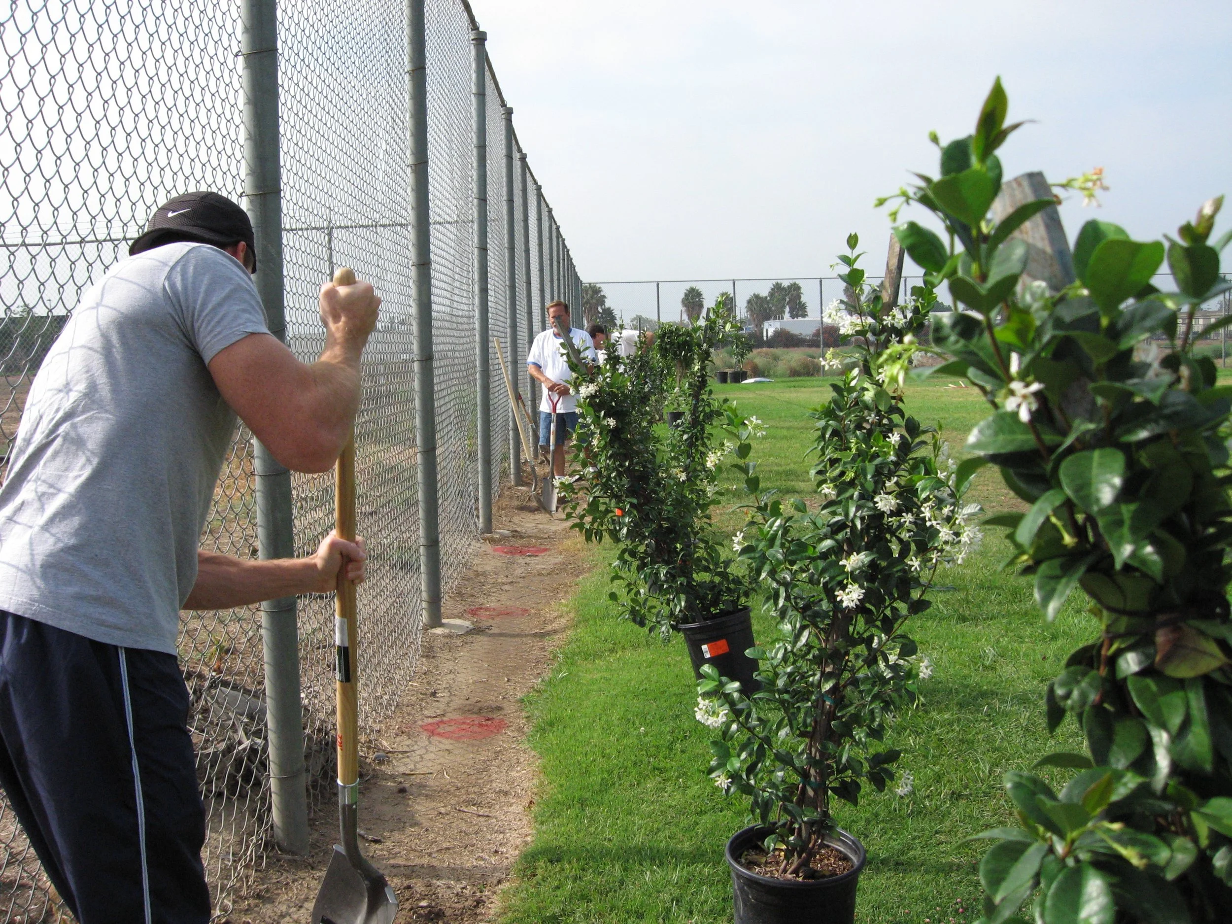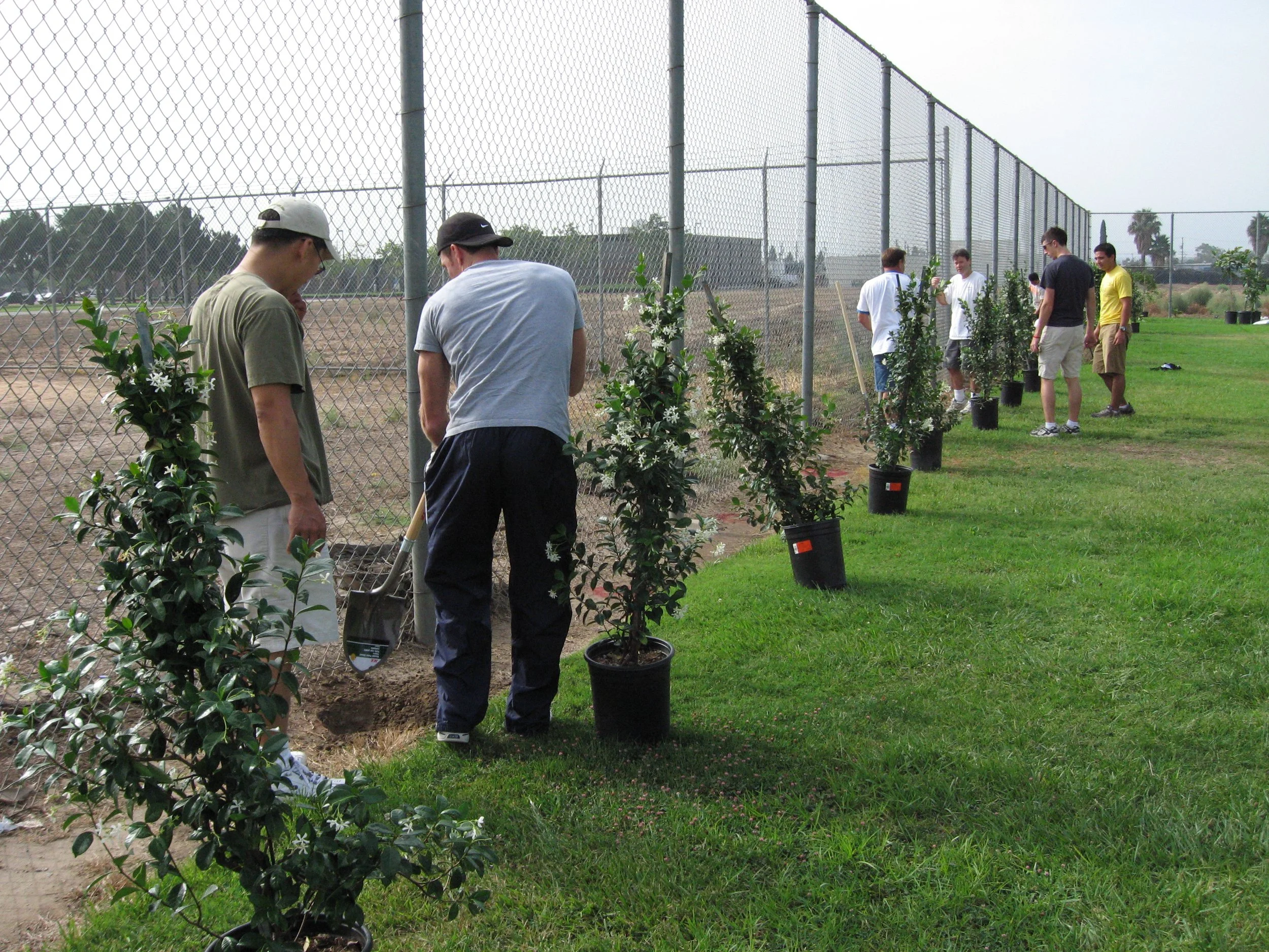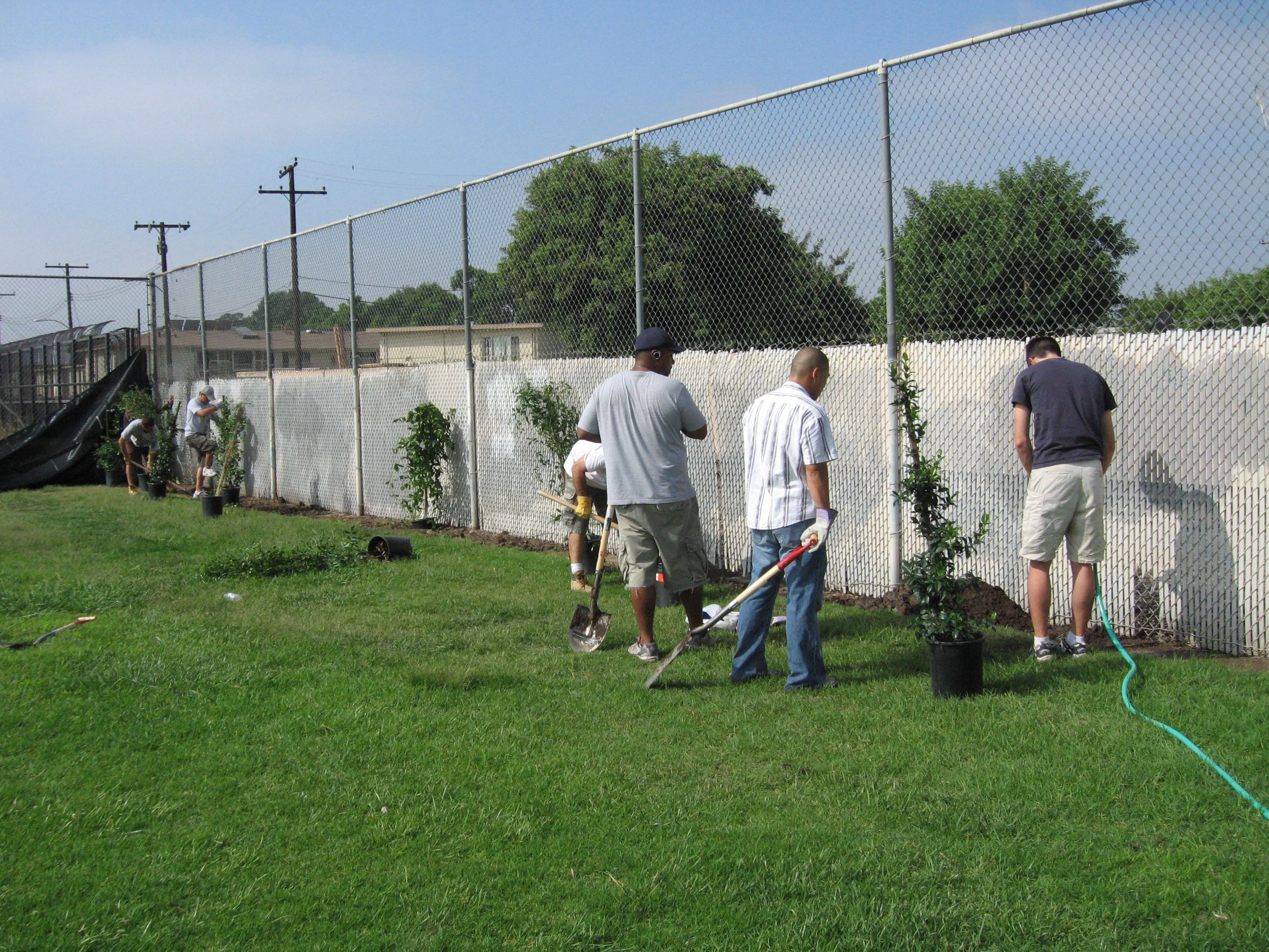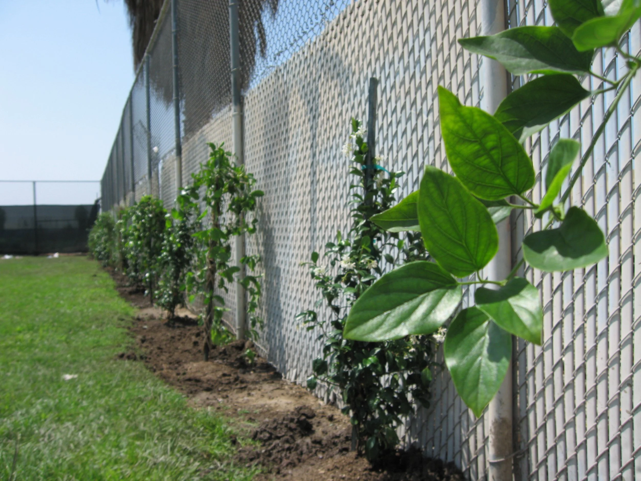 The field used by the students at Kennedy Elementary School was a dusty barren field with no plants or trees. A chain link fence enclosed the field. Give & Grow planted trees and shrubs to create a more inviting field. Give & Grow also installed attractive netting to cover the fence. The improvements to the field create areas of shade as well as cover the unattractive fencing, producing an enclosed greener field.