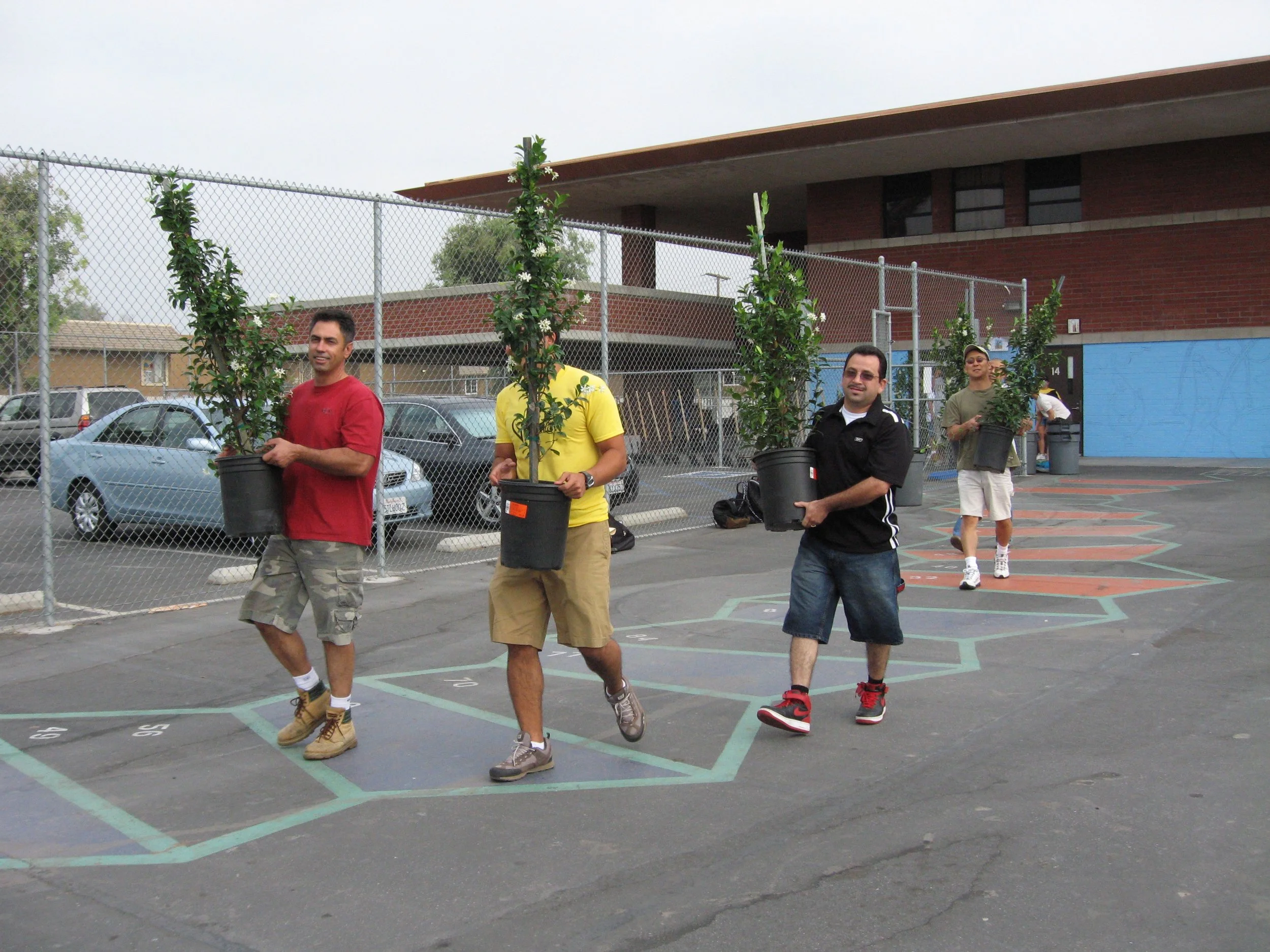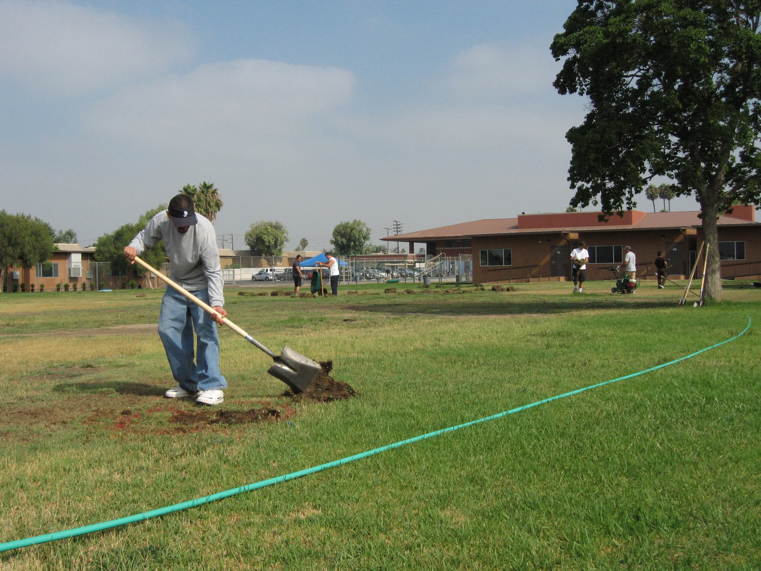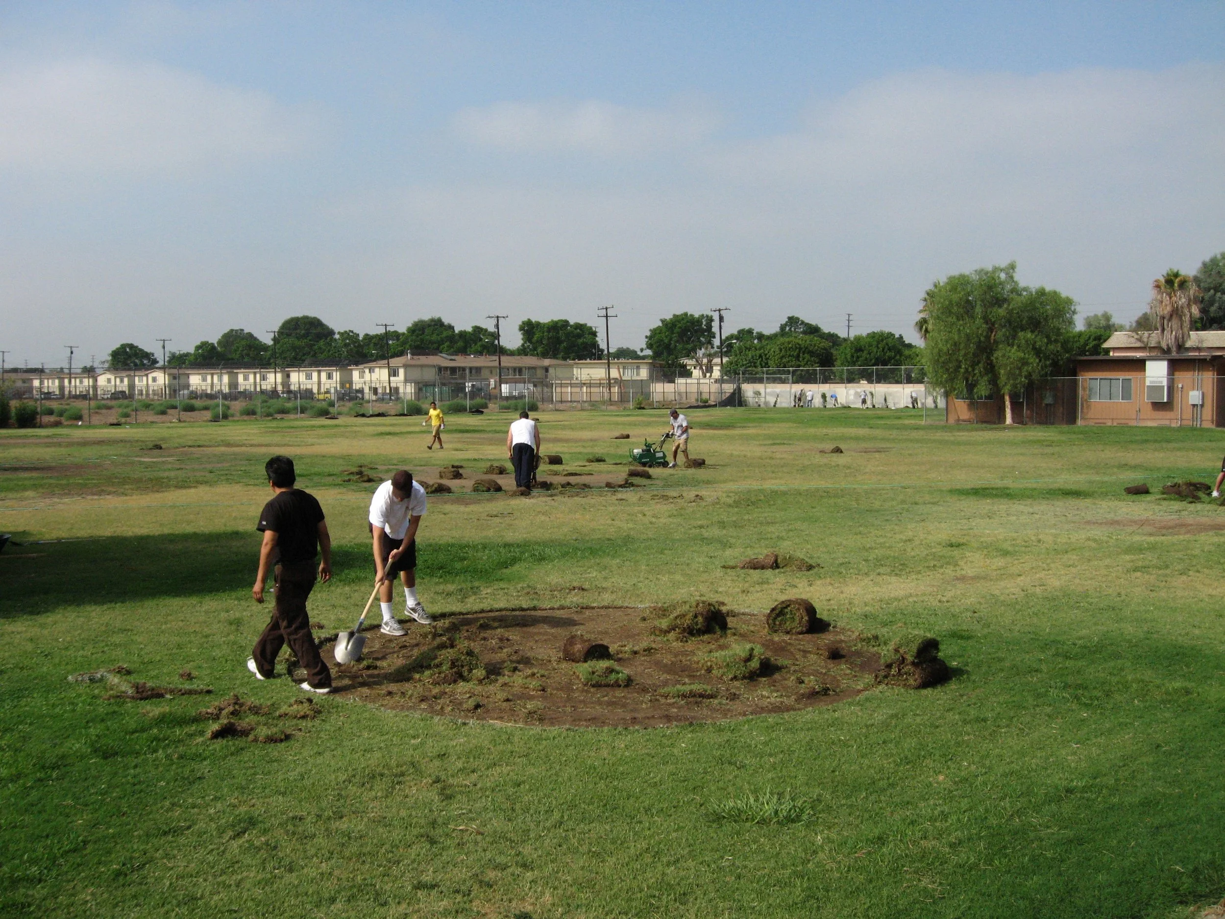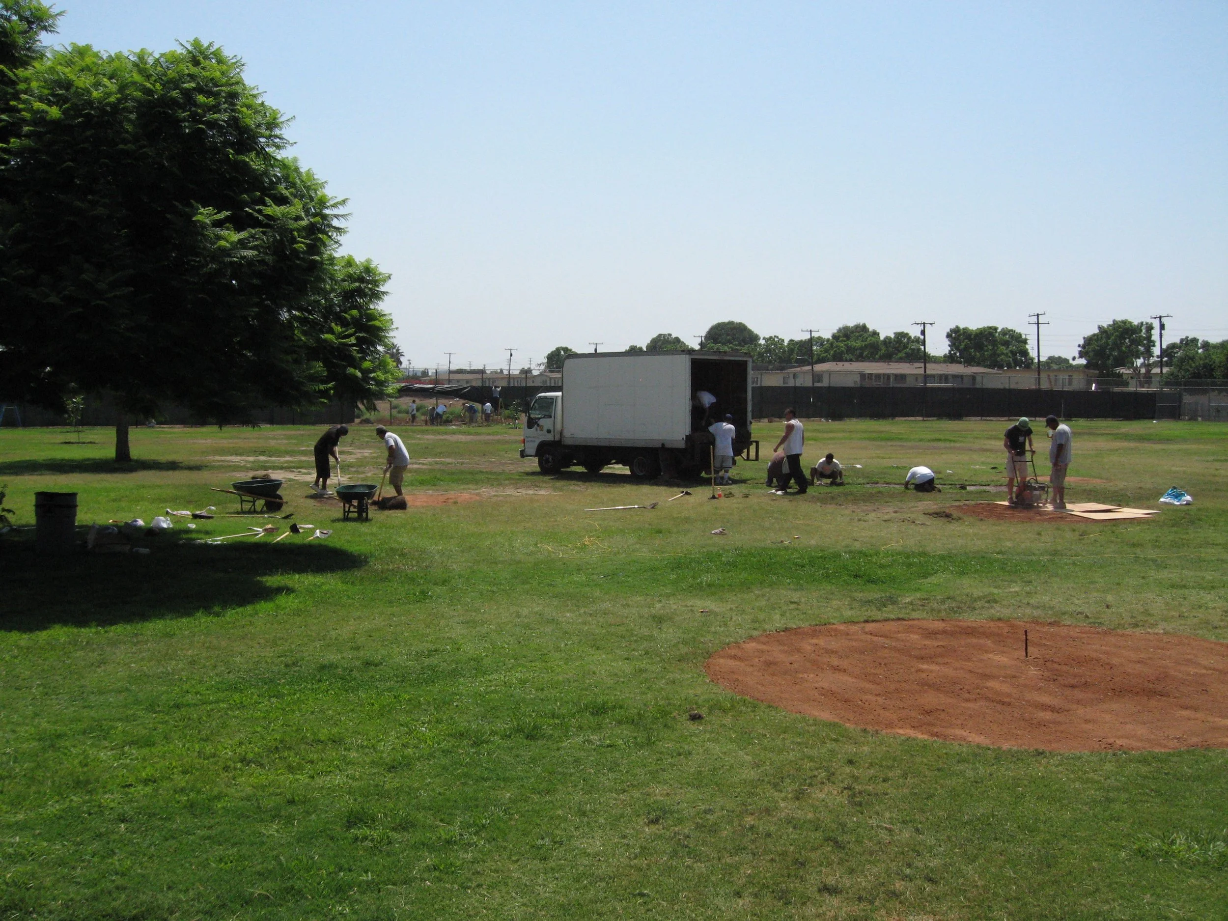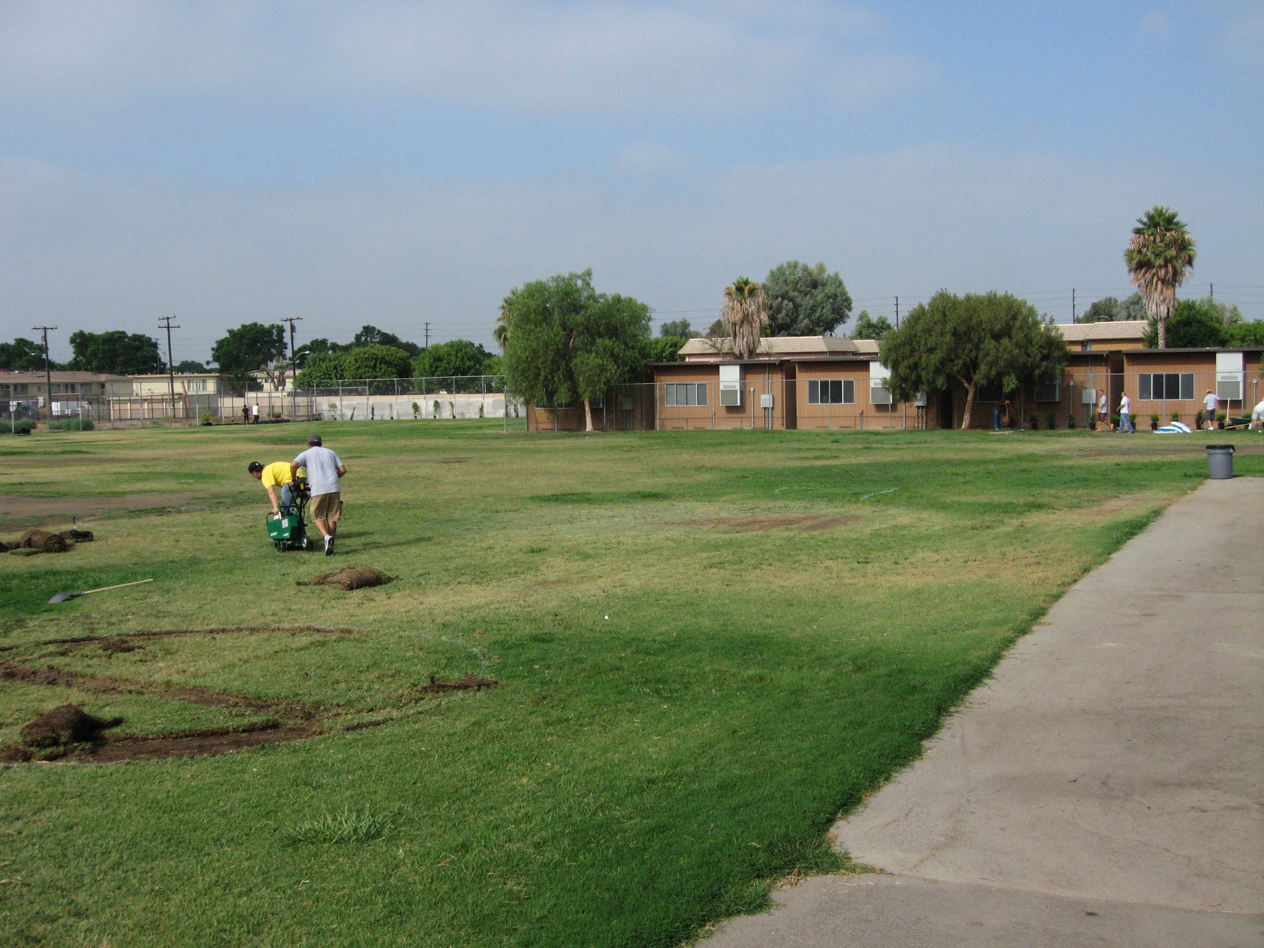 The field used by the students at Kennedy Elementary School was a dusty barren field with no plants or trees. A chain link fence enclosed the field. Give & Grow planted trees and shrubs to create a more inviting field. Give & Grow also installed attractive netting to cover the fence. The improvements to the field create areas of shade as well as cover the unattractive fencing, producing an enclosed greener field.