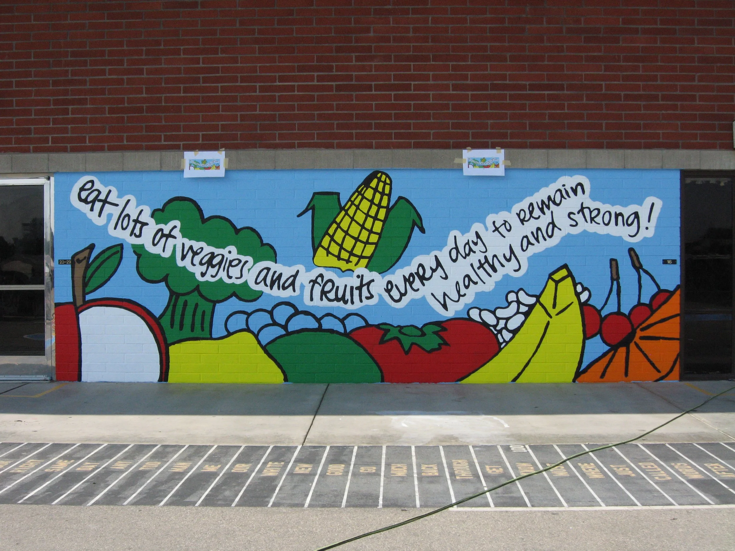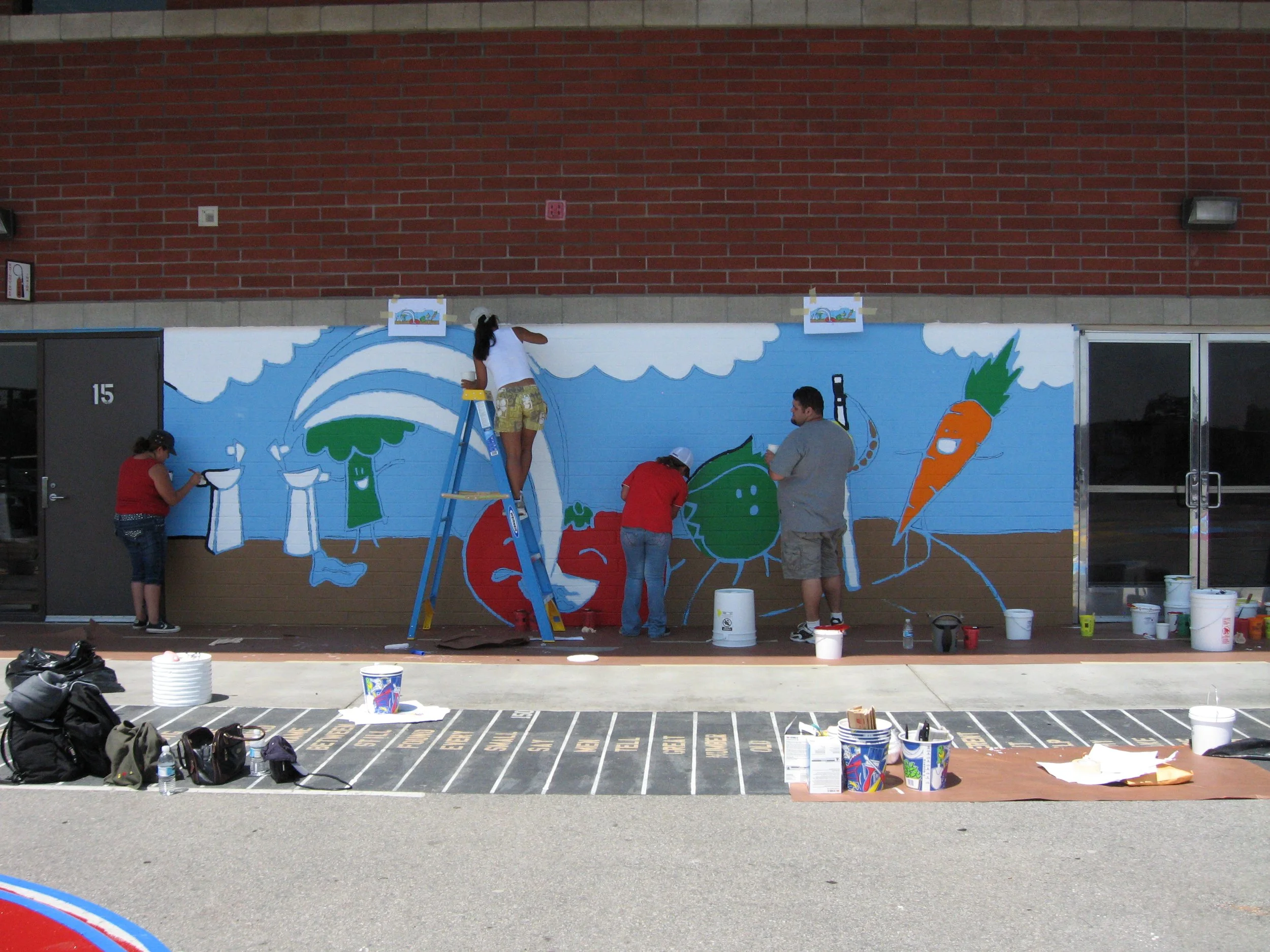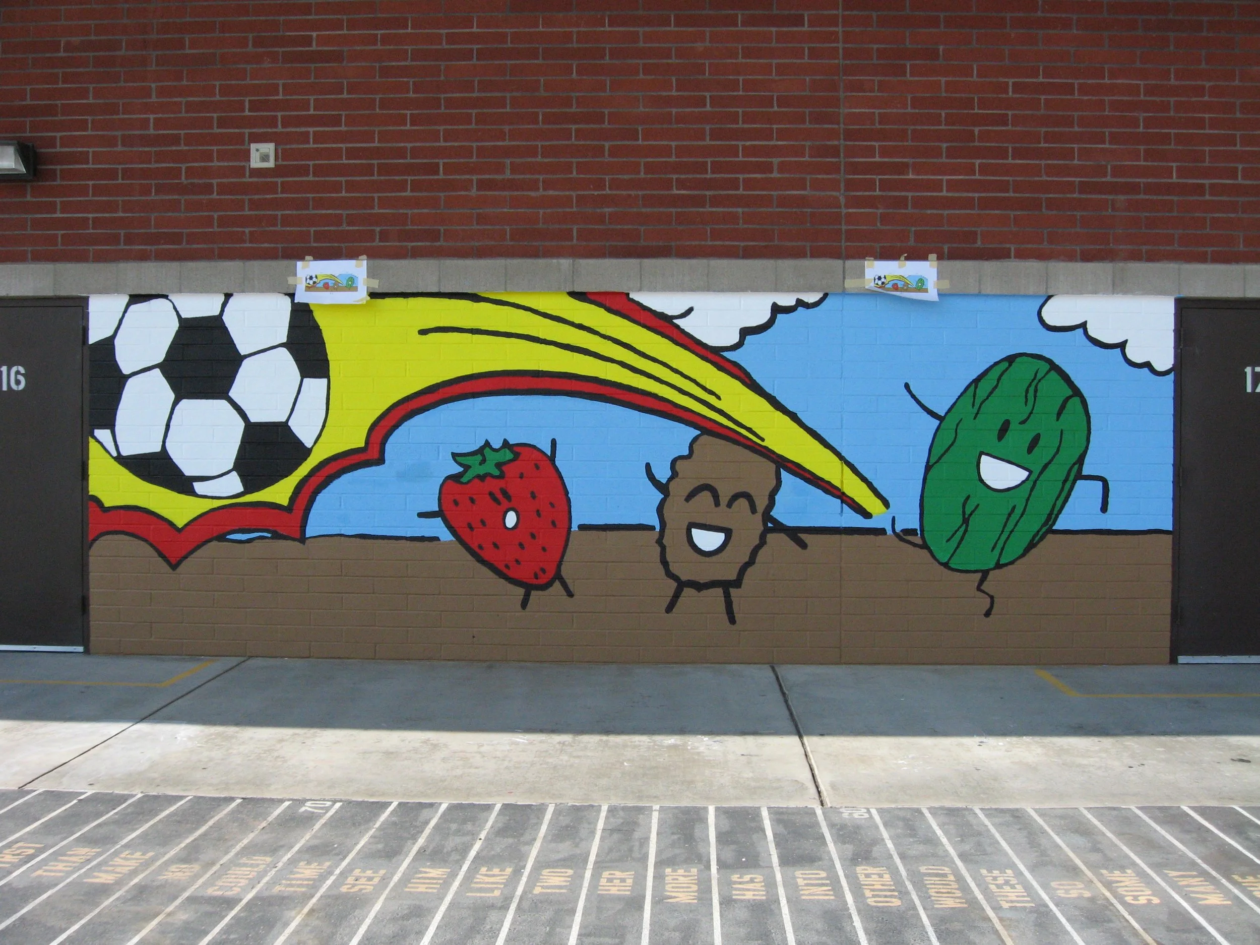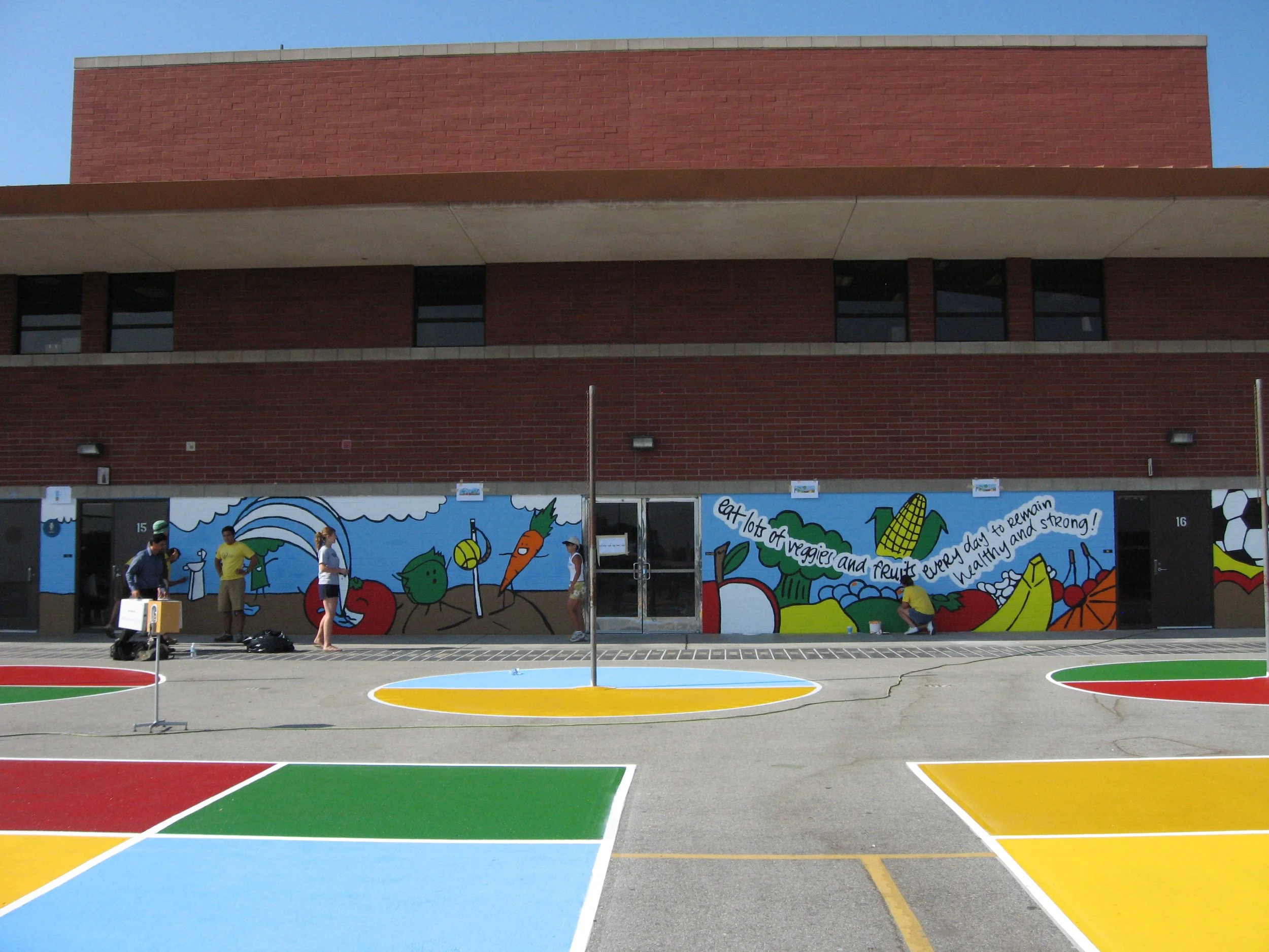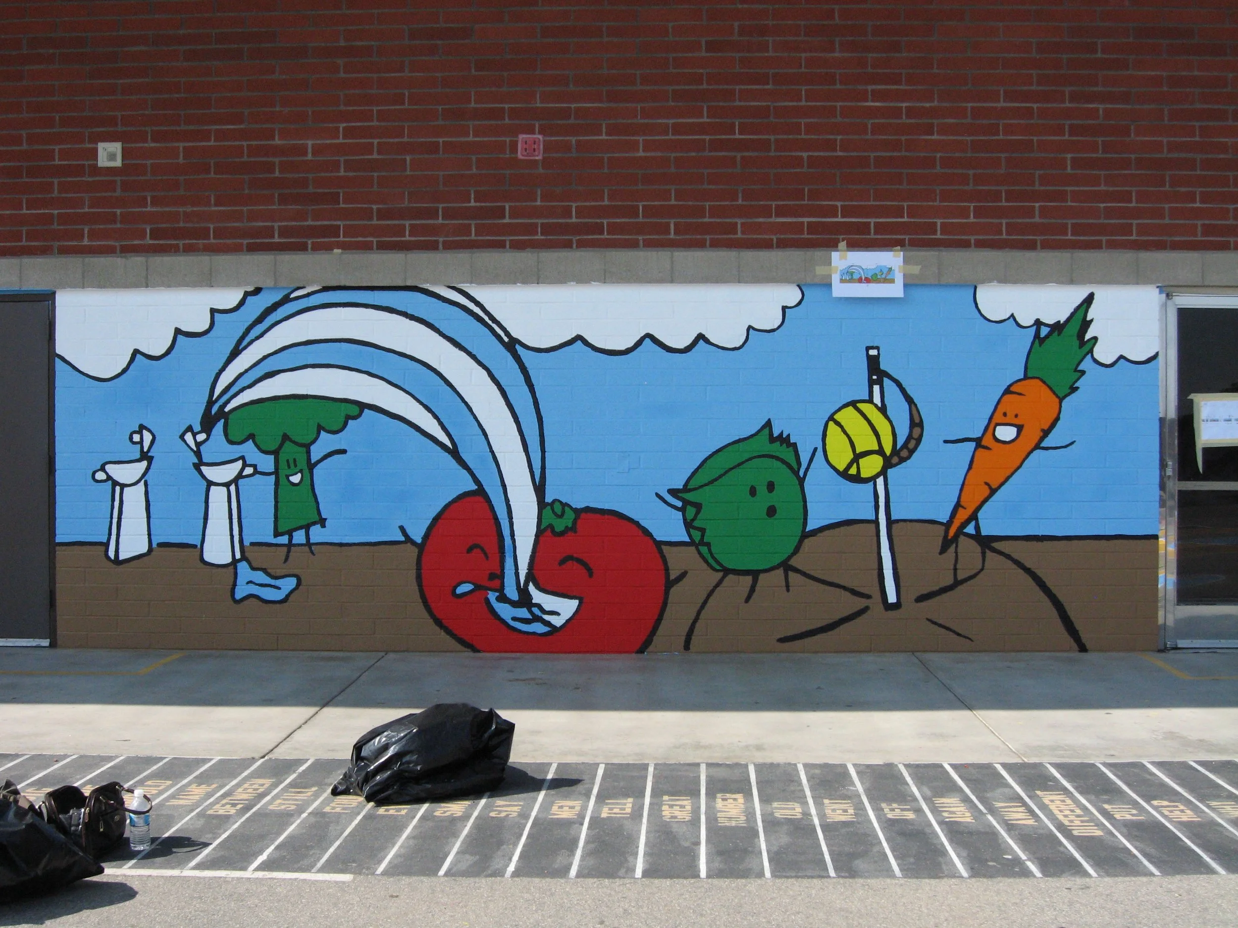 The walls surrounding the playground were plain brick, and the entire play area appeared very bleak. Give & Grow designed and painted a 170-foot mural on the entire back wall of the school building. The mural illustrates fruits and vegetables playing sports and being active. This is to promote a healthy lifestyle pivotal in combating childhood obesity. This mural not only provides color and vitality to the playground but addresses an important topic.