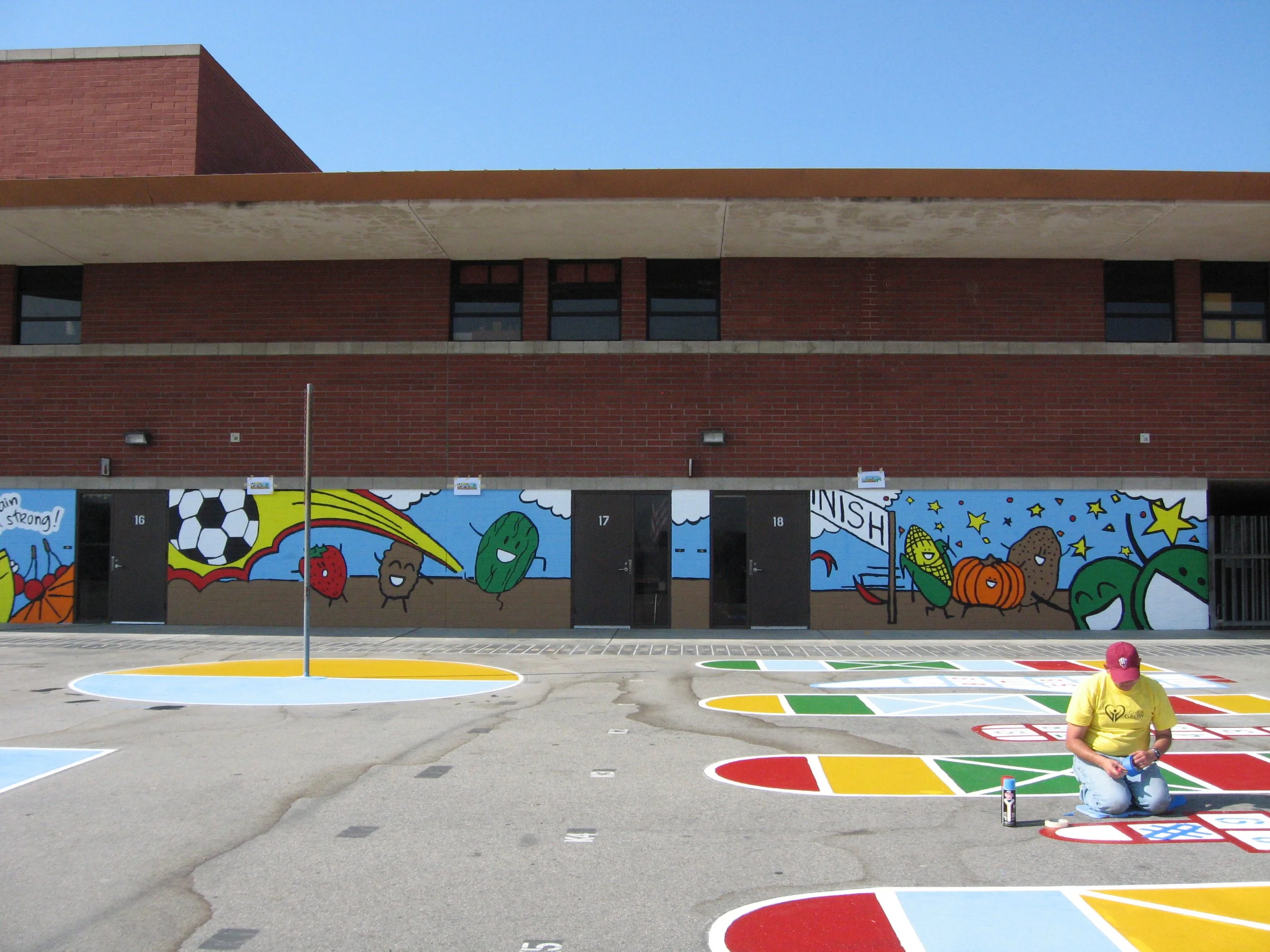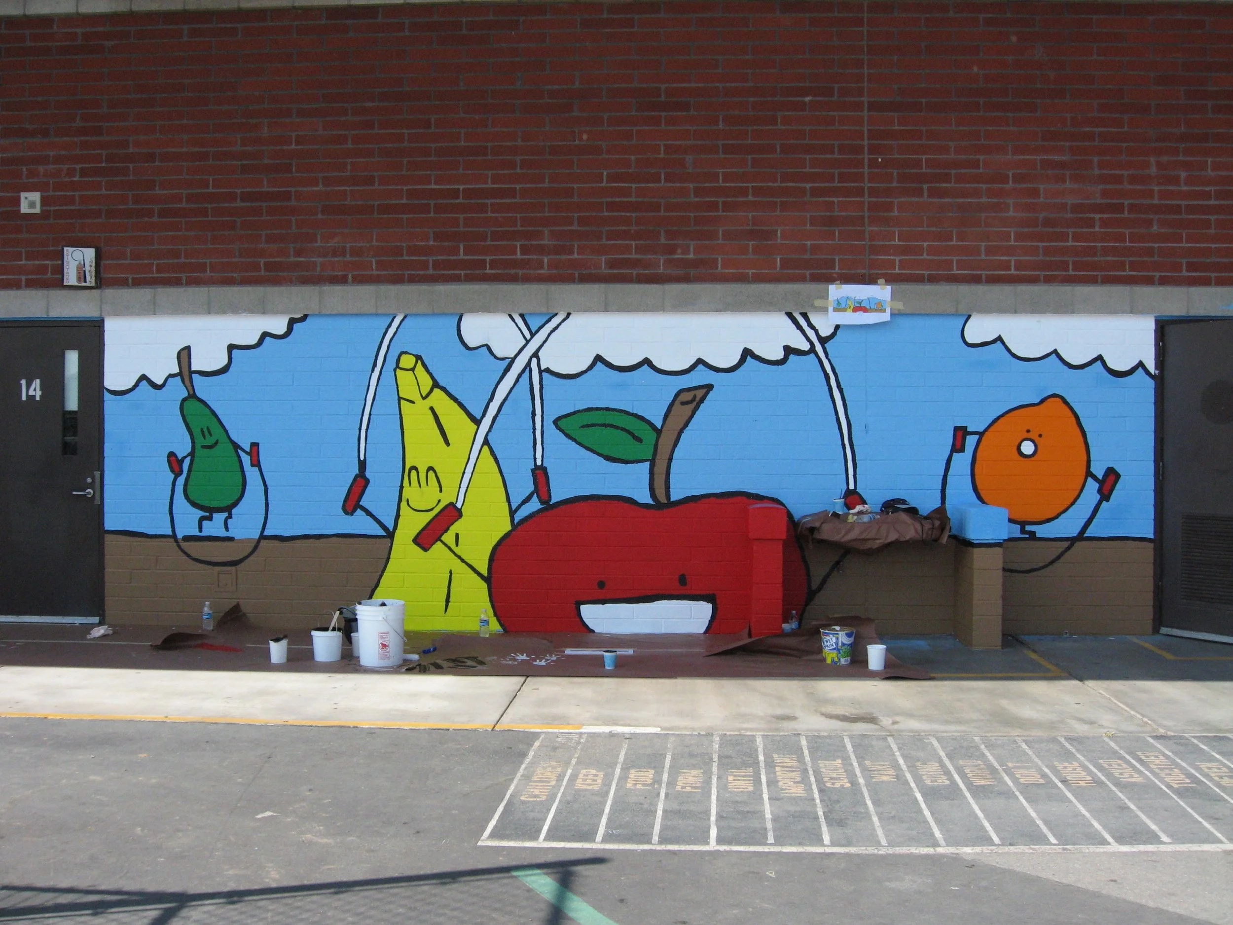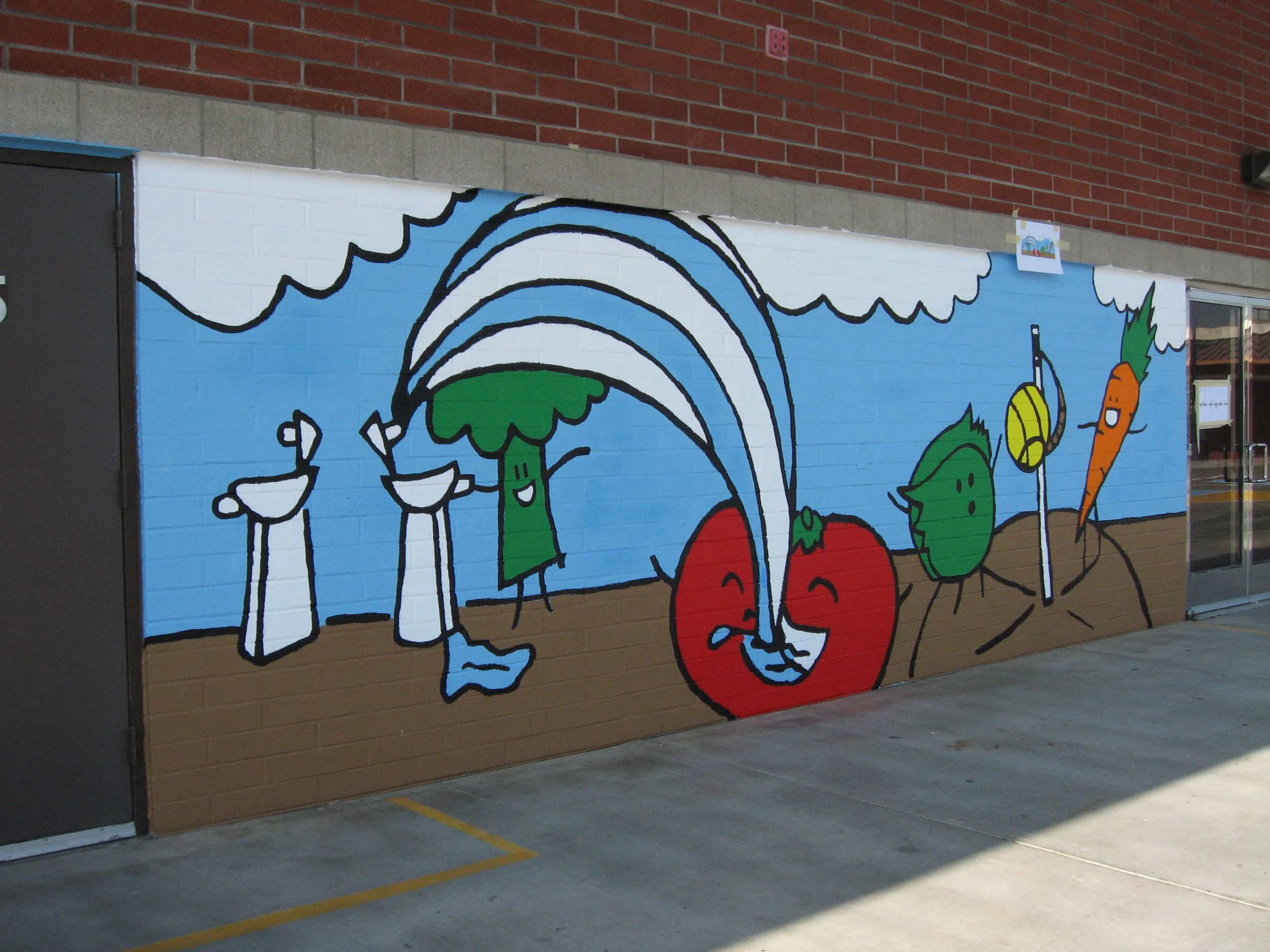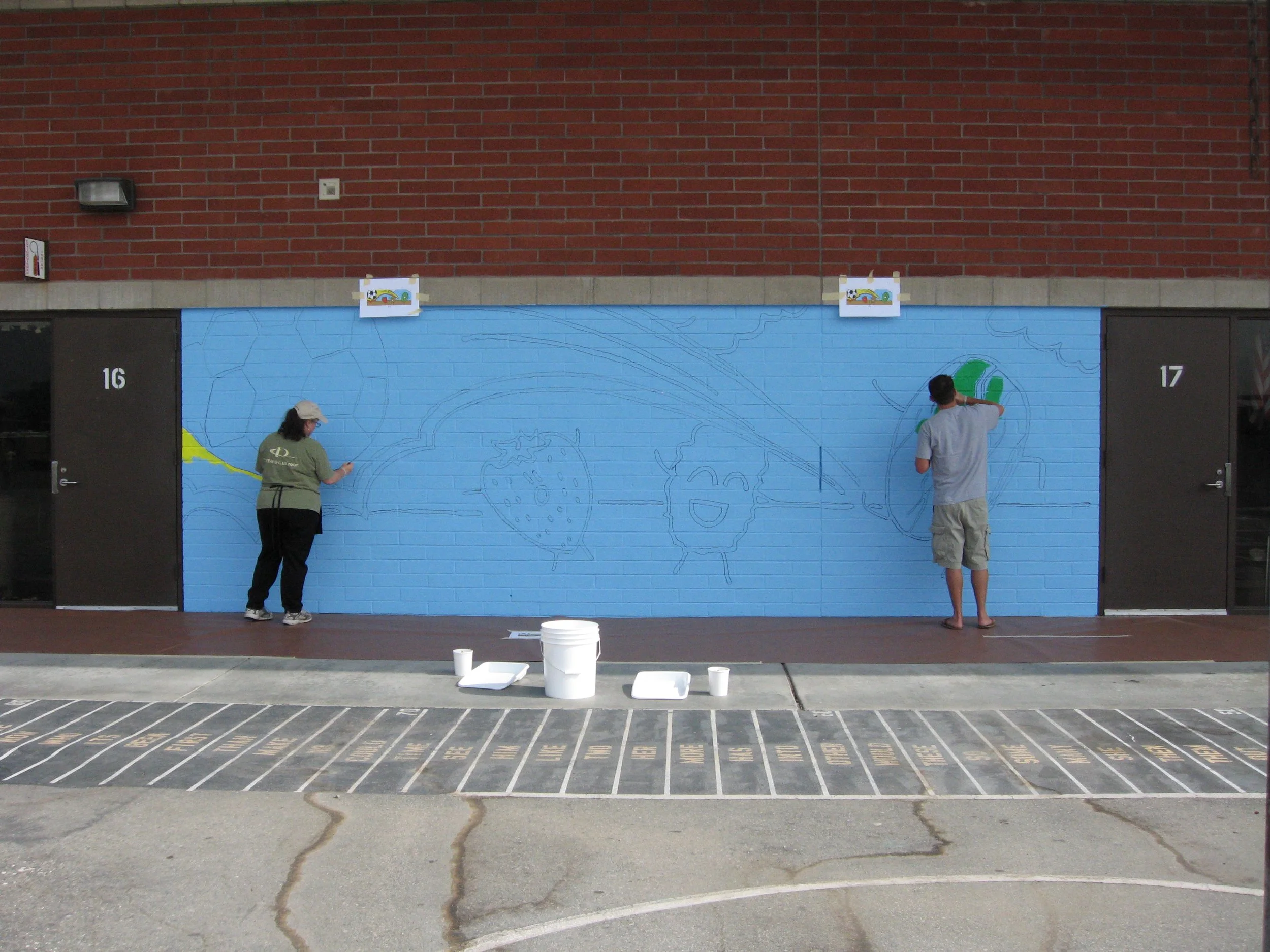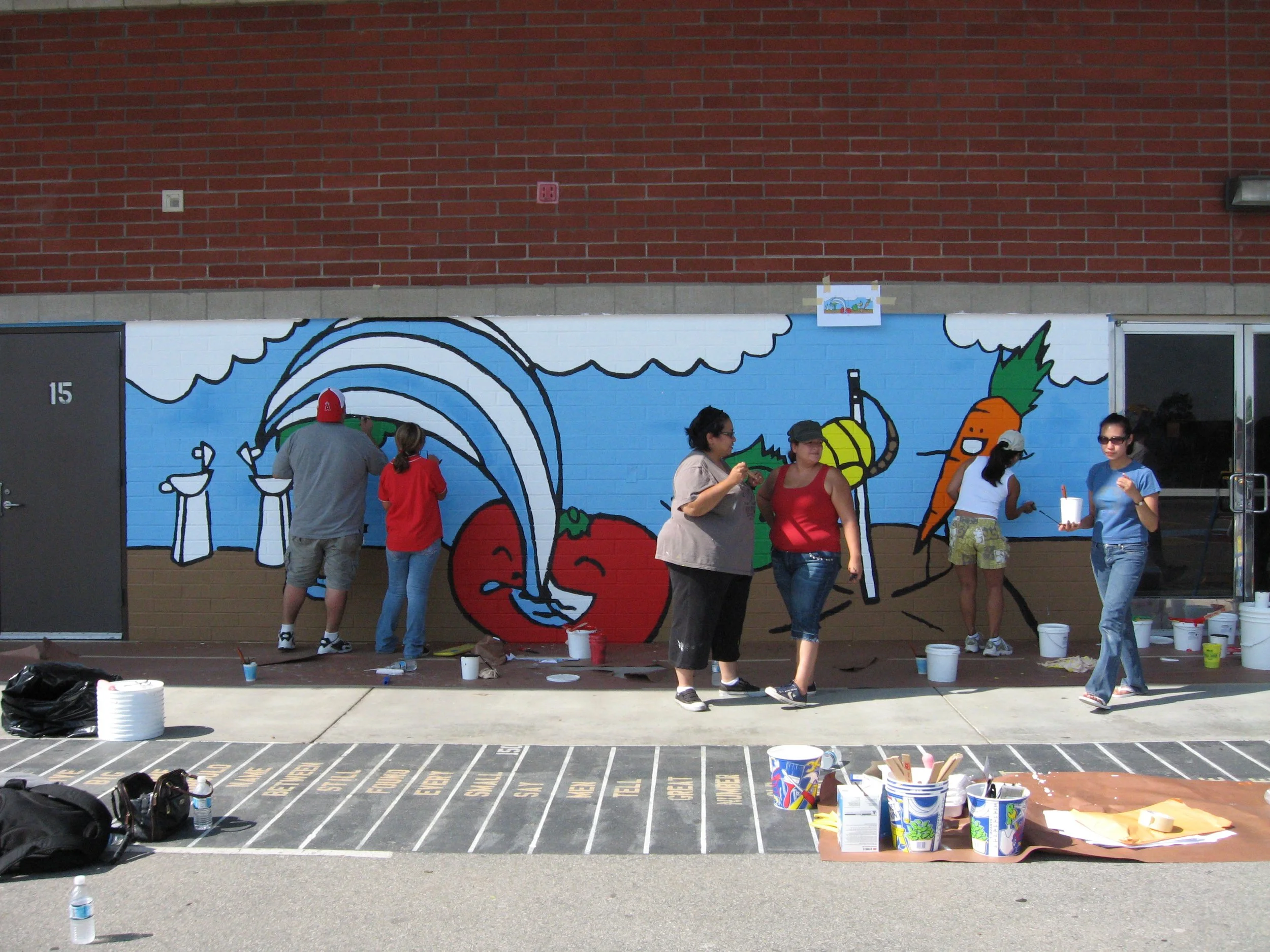 The walls surrounding the playground were plain brick, and the entire play area appeared very bleak. Give & Grow designed and painted a 170-foot mural on the entire back wall of the school building. The mural illustrates fruits and vegetables playing sports and being active. This is to promote a healthy lifestyle pivotal in combating childhood obesity. This mural not only provides color and vitality to the playground but addresses an important topic.