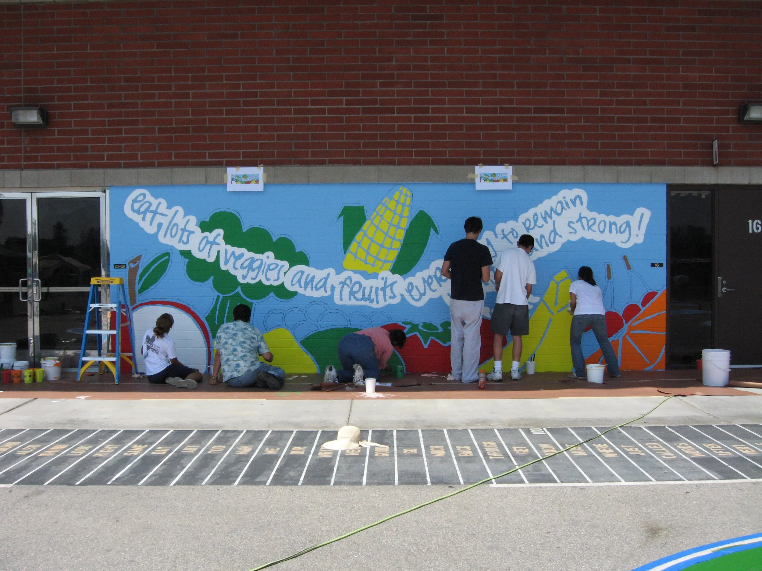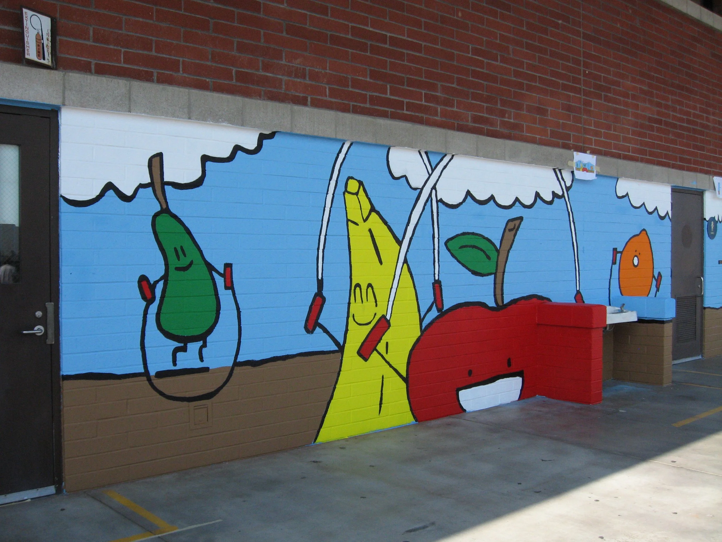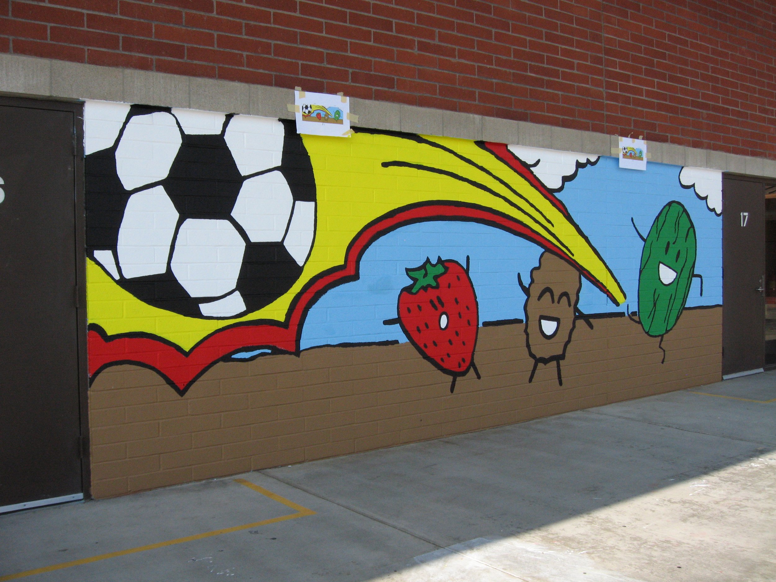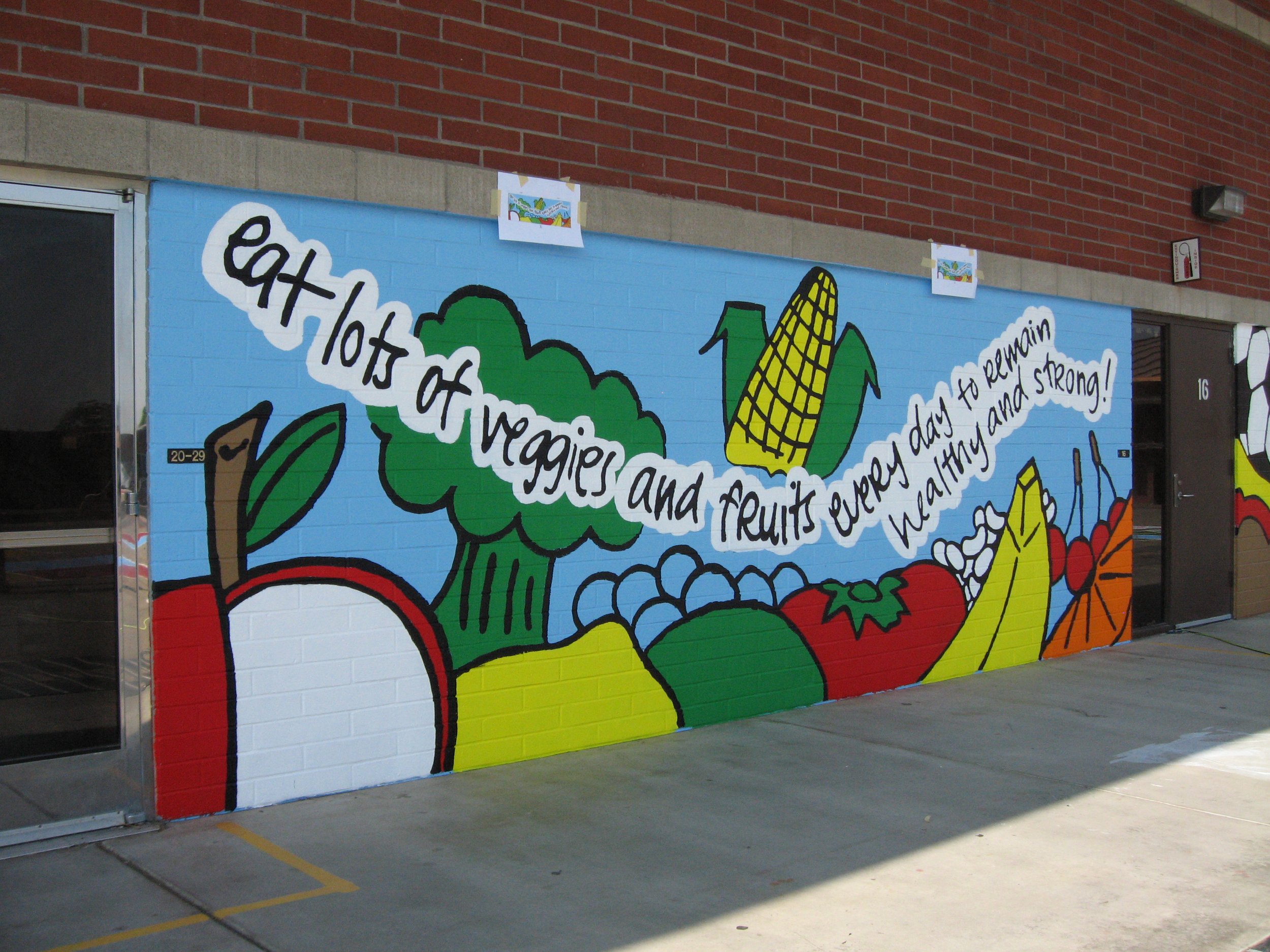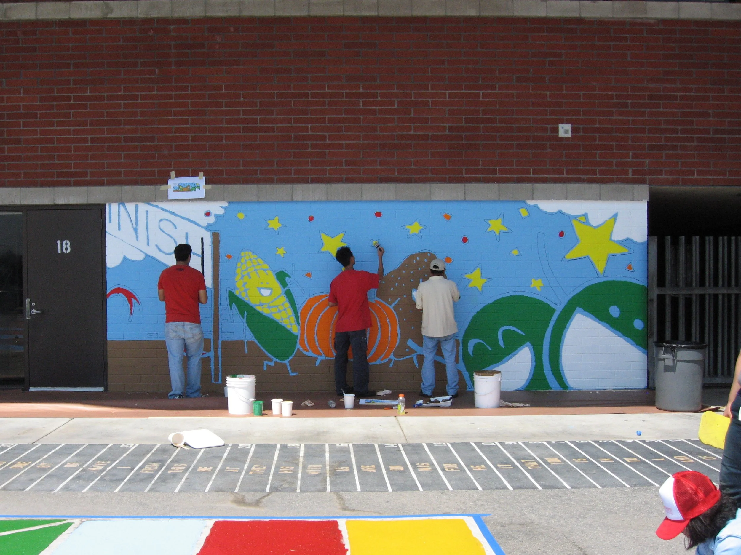The walls surrounding the playground were plain brick, and the entire play area appeared very bleak. Give & Grow designed and painted a 170-foot mural on the entire back wall of the school building. The mural illustrates fruits and vegetables playing sports and being active. This is to promote a healthy lifestyle pivotal in combating childhood obesity. This mural not only provides color and vitality to the playground but addresses an important topic.