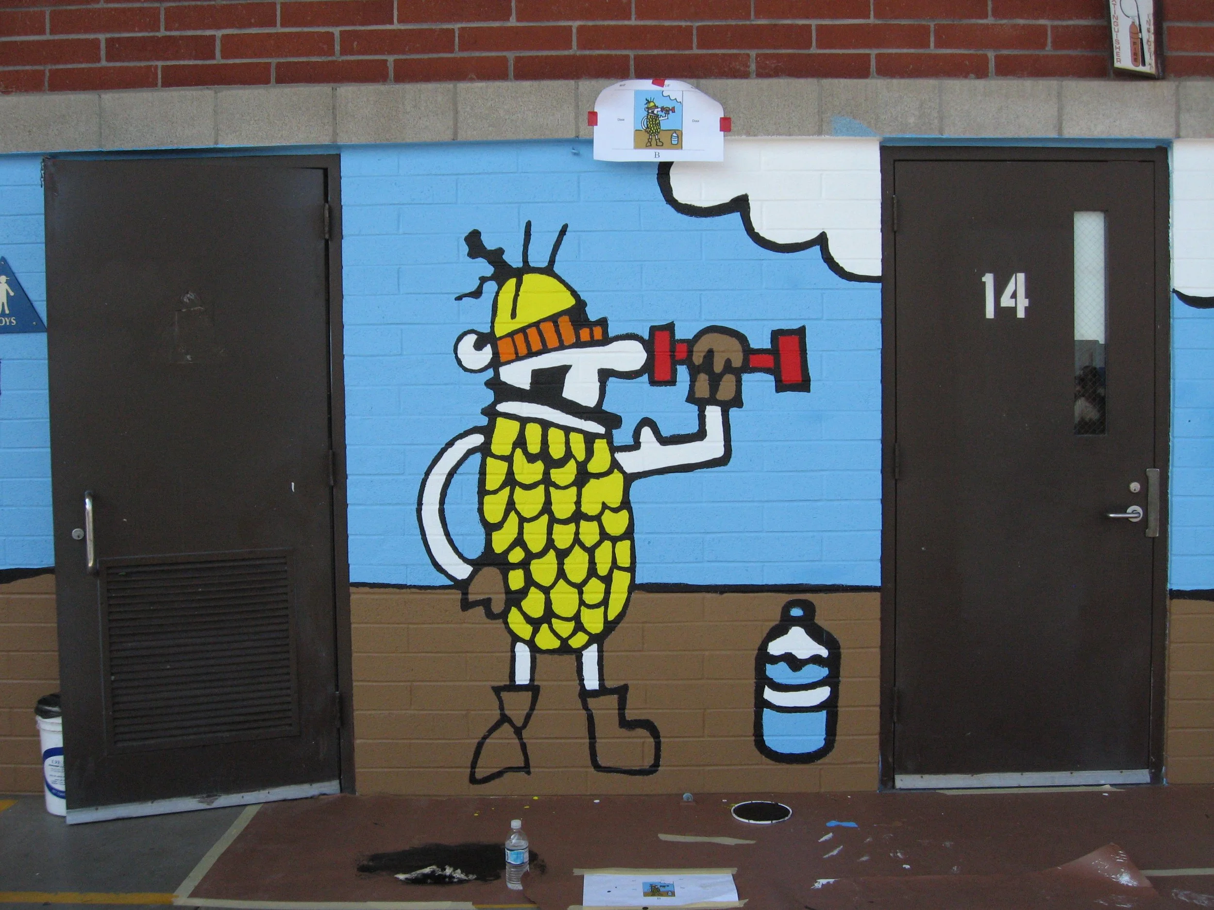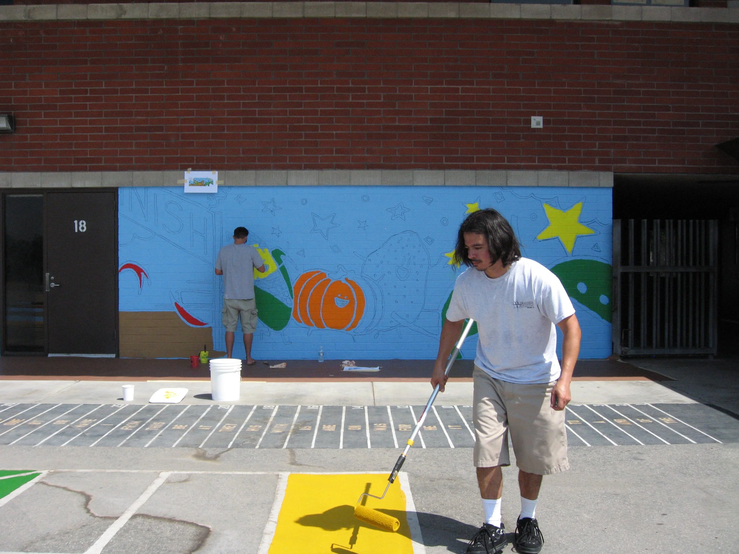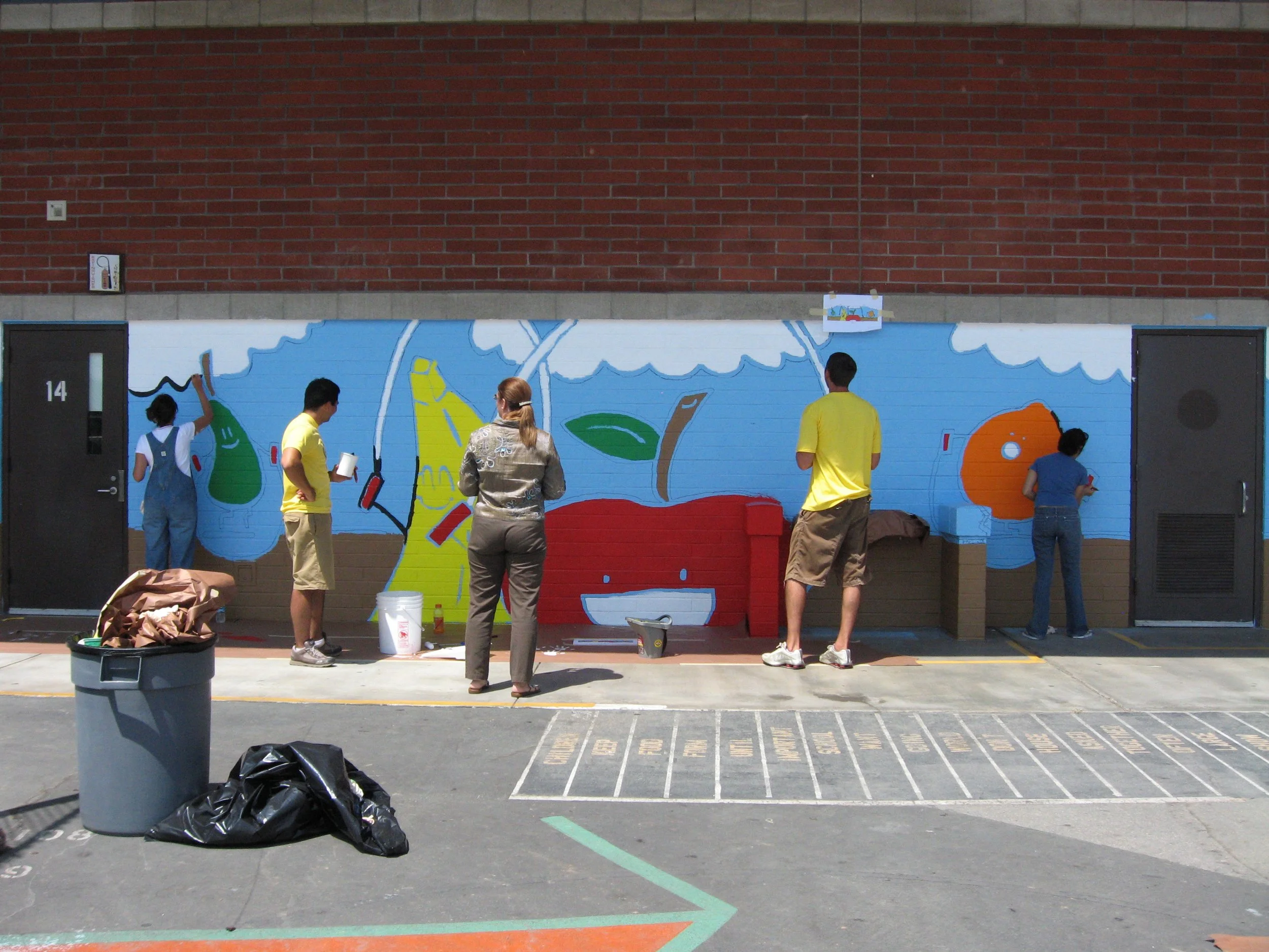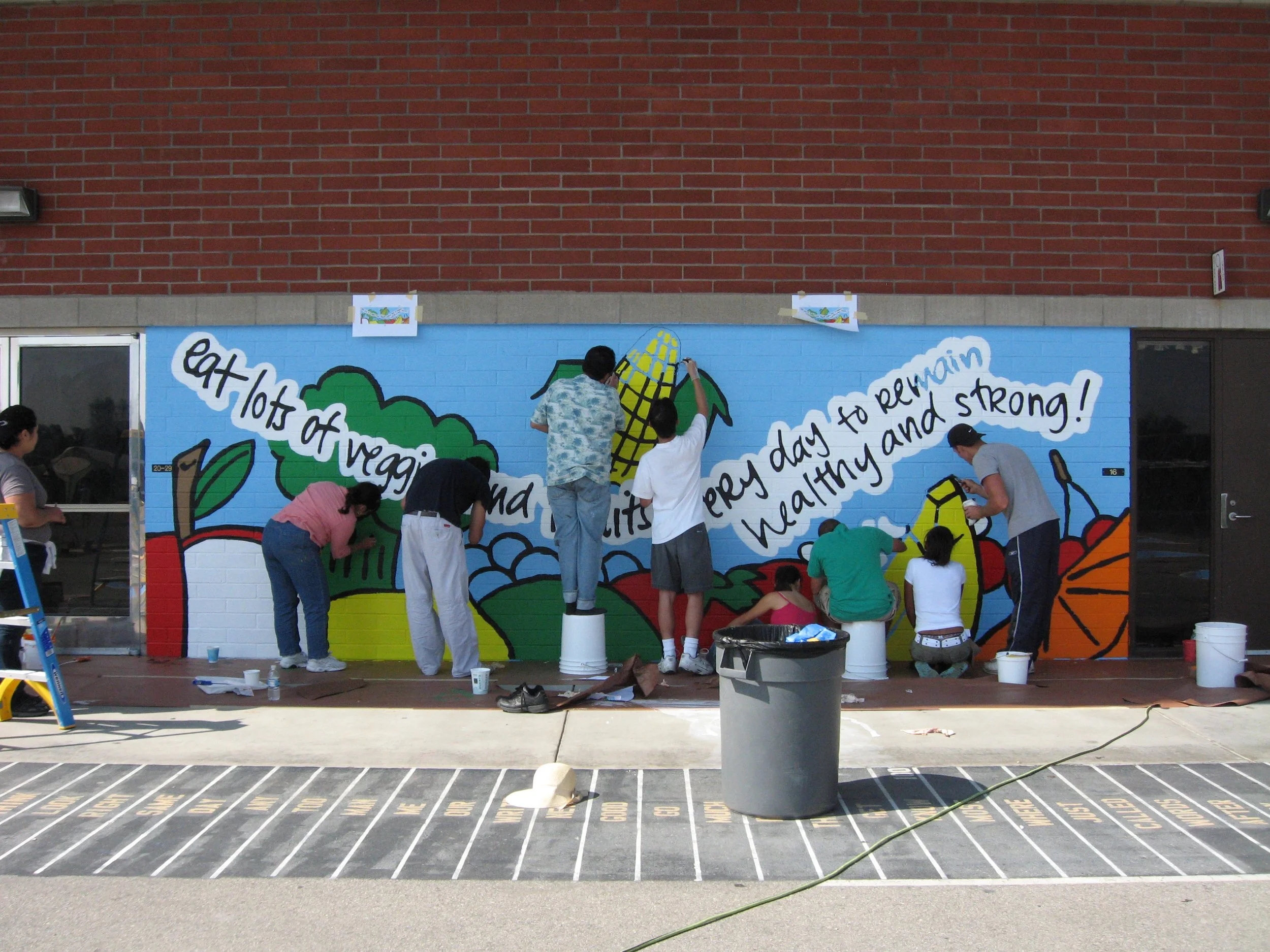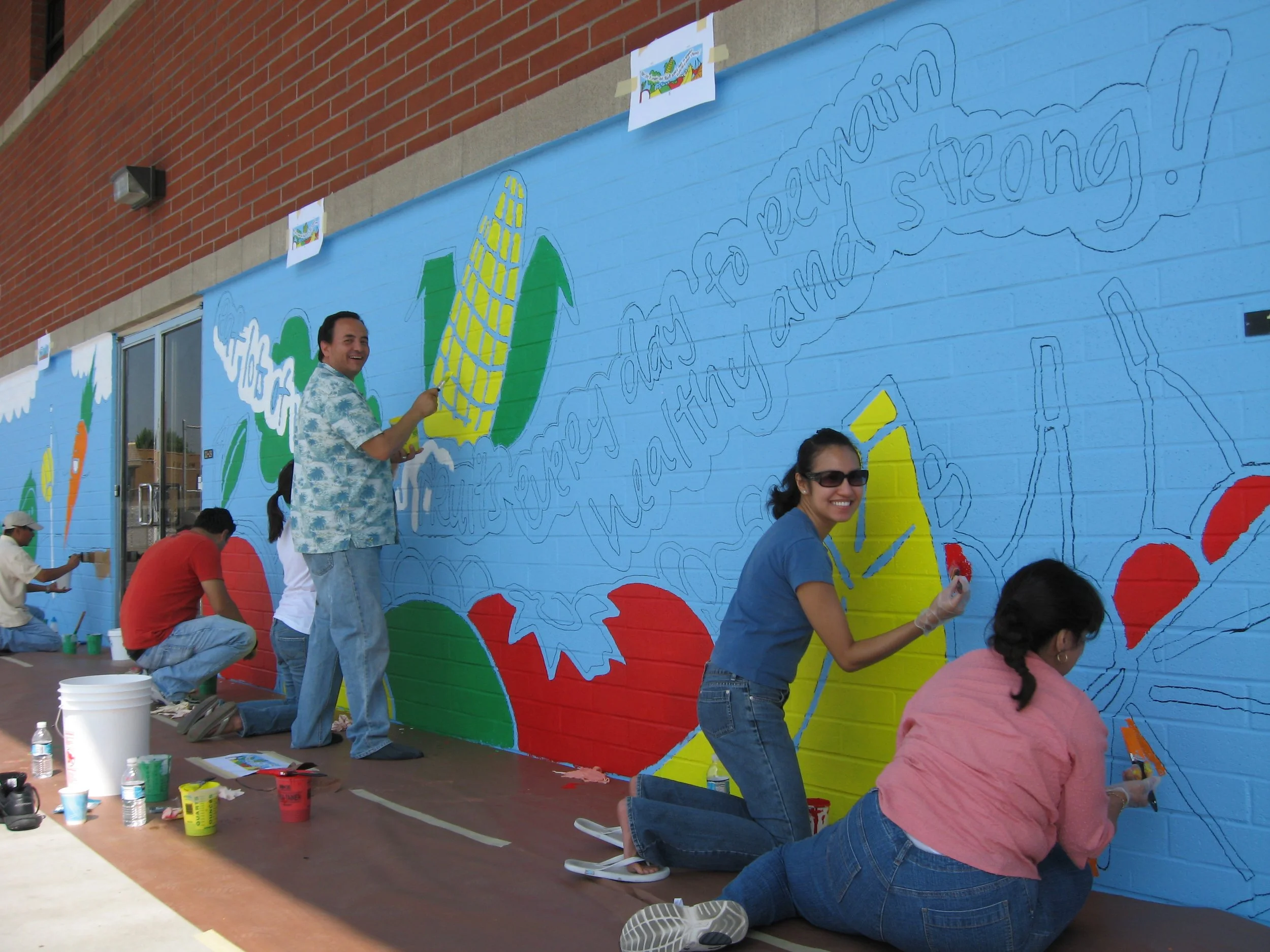 The walls surrounding the playground were plain brick, and the entire play area appeared very bleak. Give & Grow designed and painted a 170-foot mural on the entire back wall of the school building. The mural illustrates fruits and vegetables playing sports and being active. This is to promote a healthy lifestyle pivotal in combating childhood obesity. This mural not only provides color and vitality to the playground but addresses an important topic.