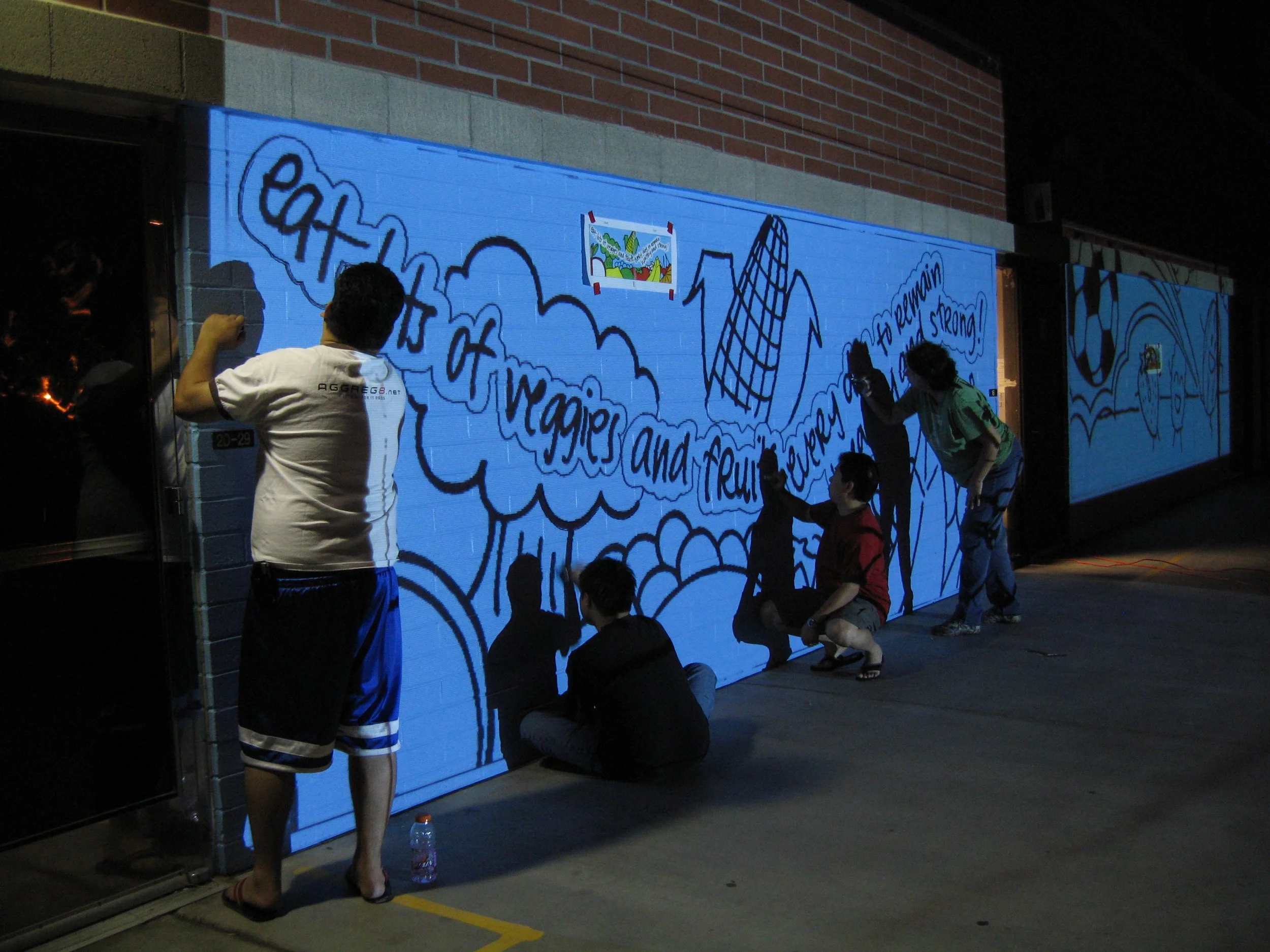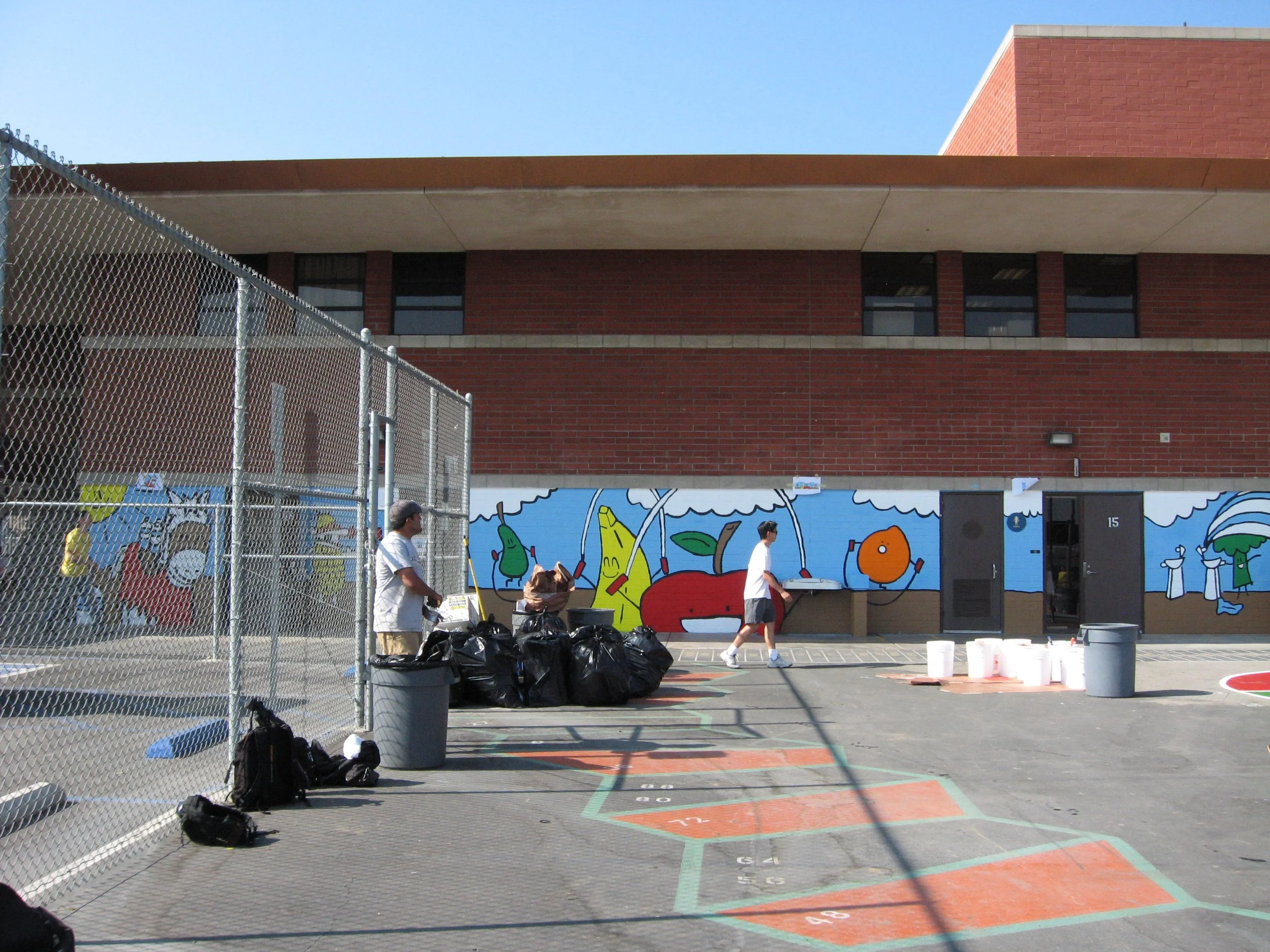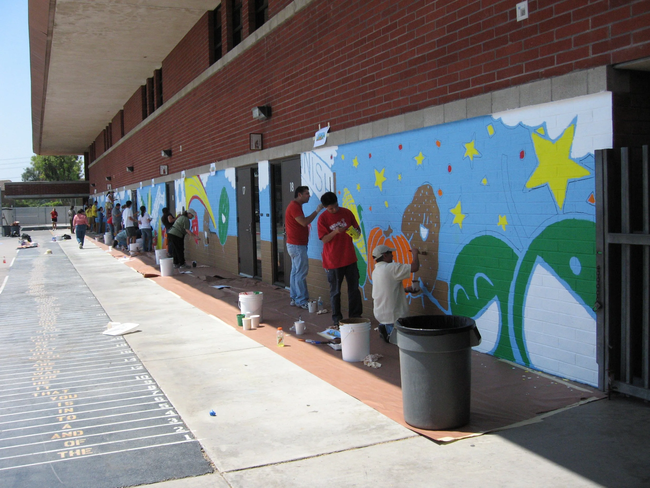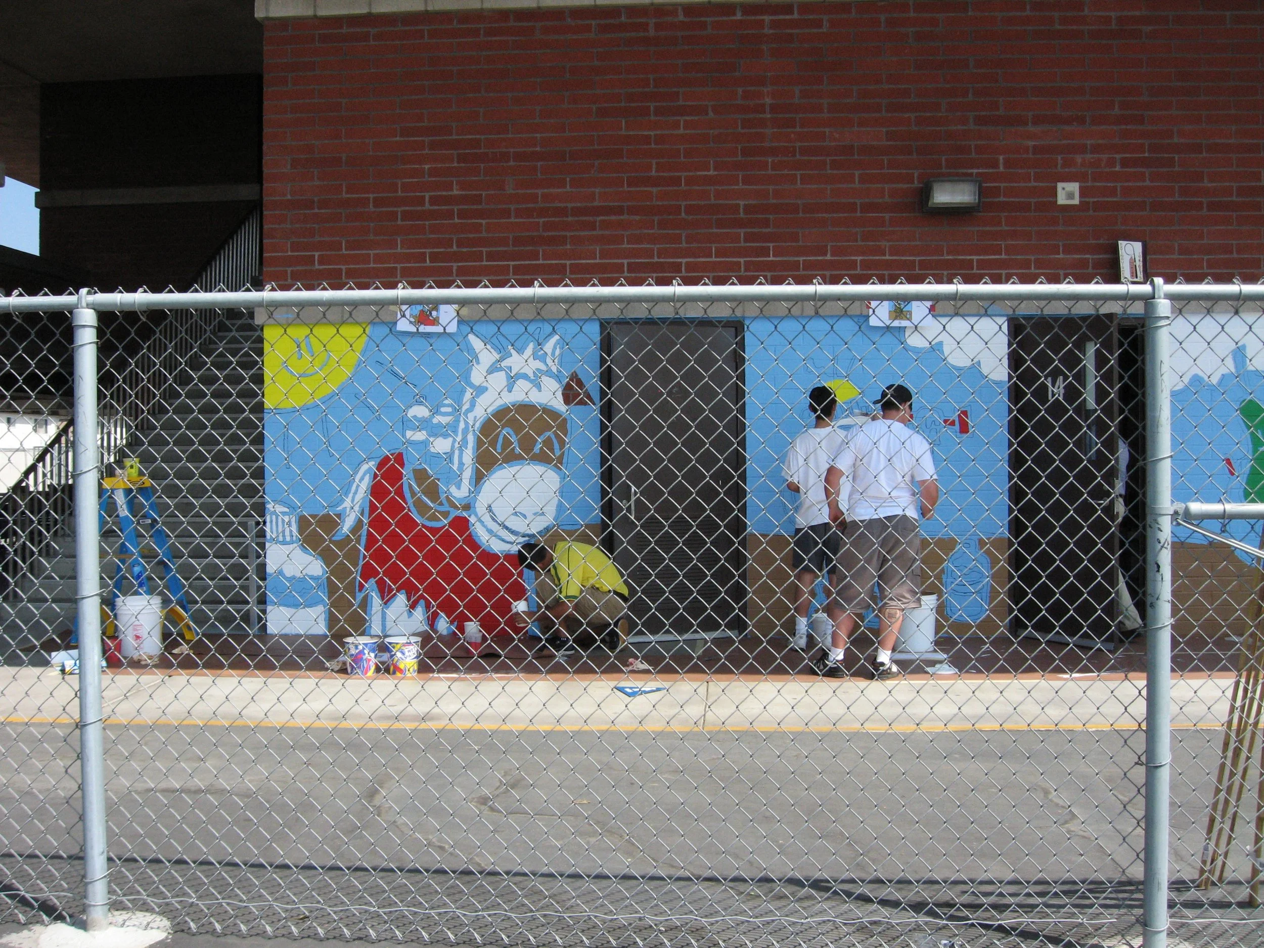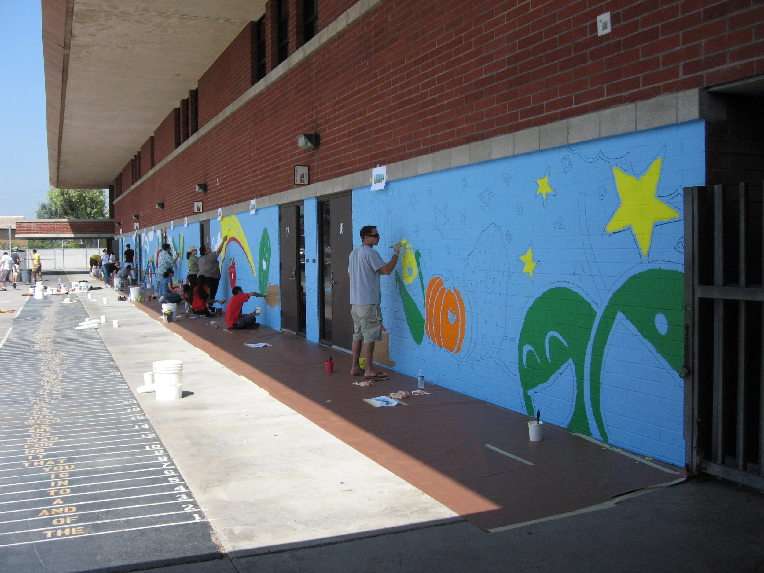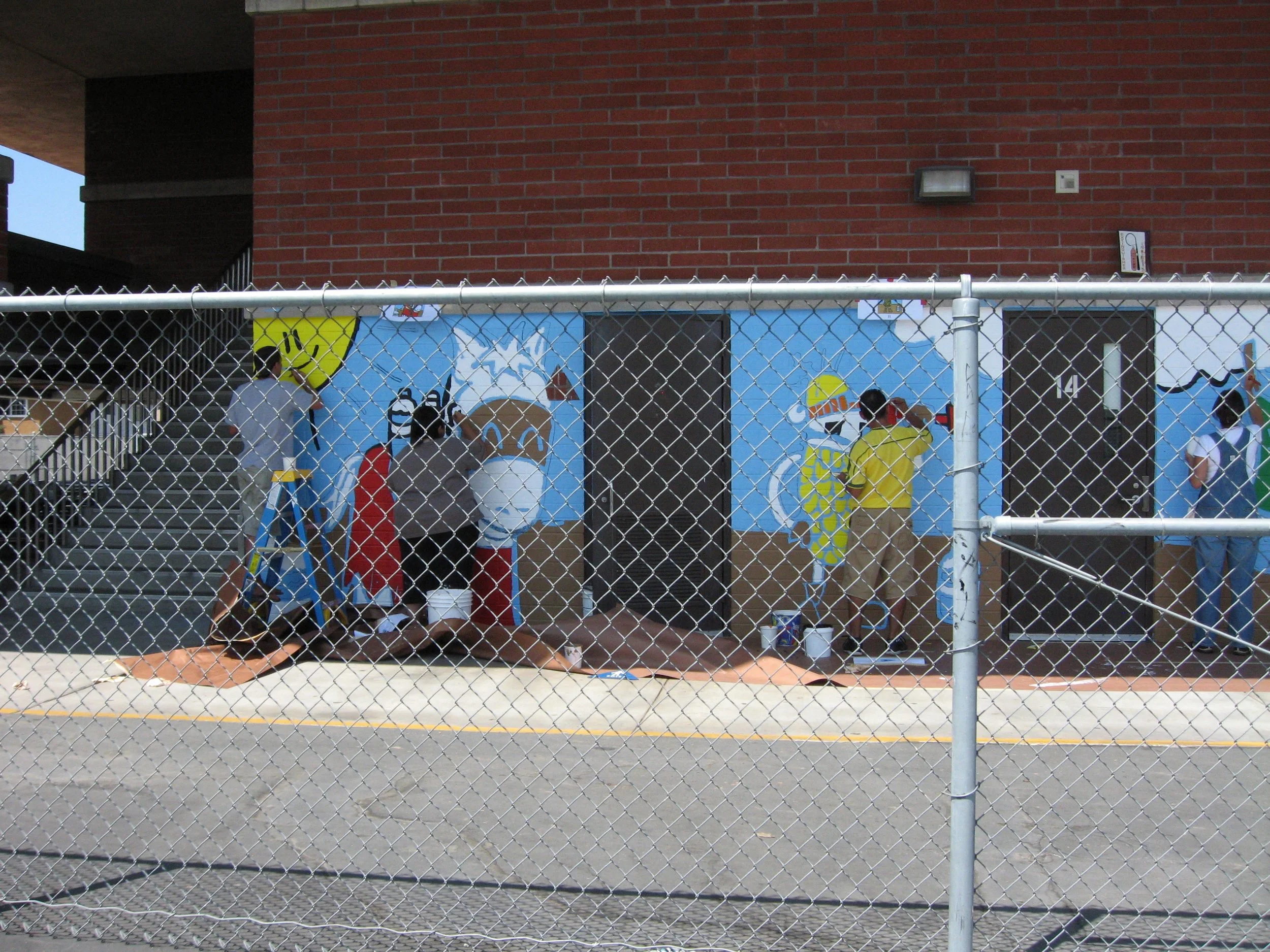 The walls surrounding the playground were plain brick, and the entire play area appeared very bleak. Give & Grow designed and painted a 170-foot mural on the entire back wall of the school building. The mural illustrates fruits and vegetables playing sports and being active. This is to promote a healthy lifestyle pivotal in combating childhood obesity. This mural not only provides color and vitality to the playground but addresses an important topic.