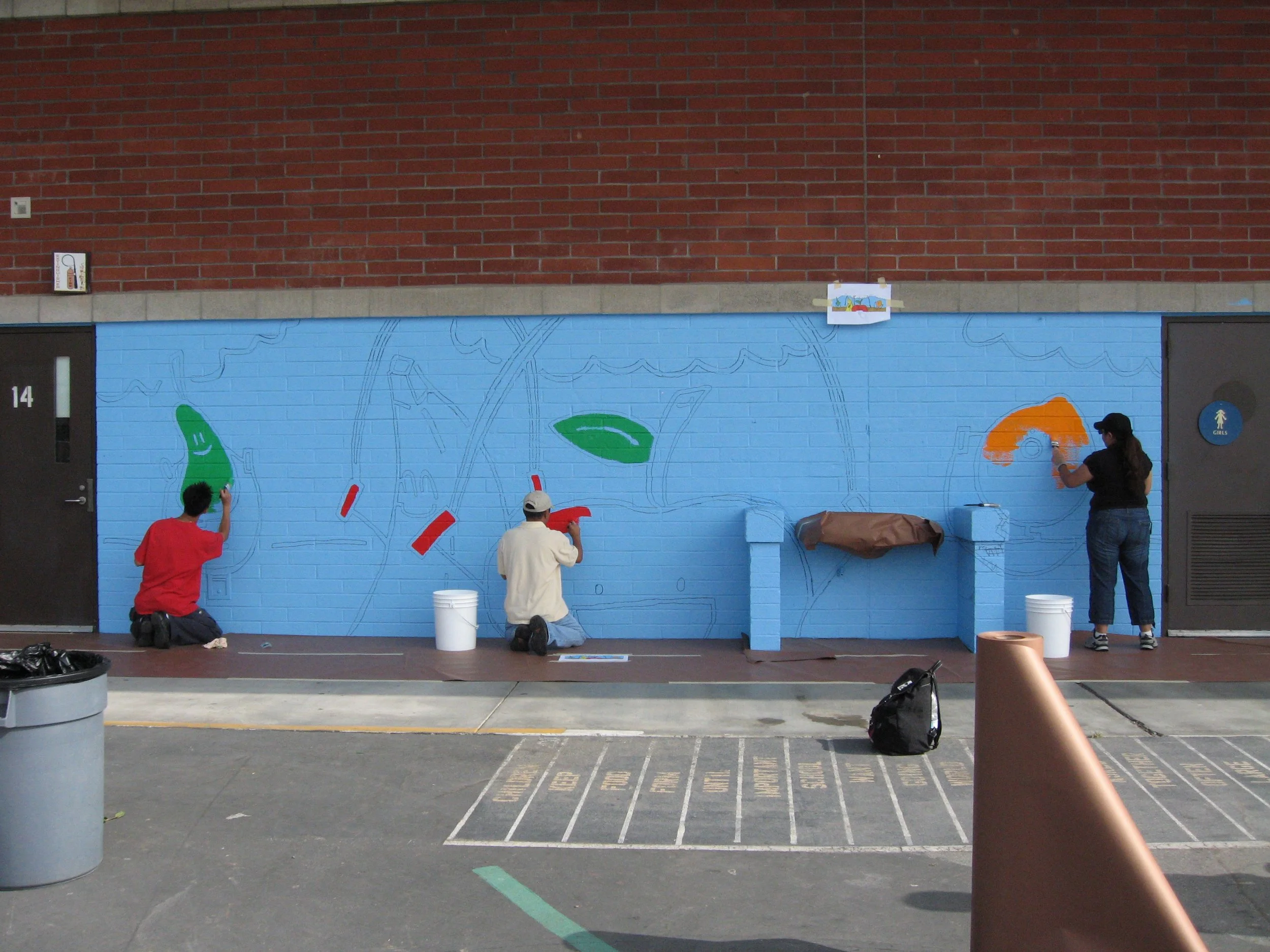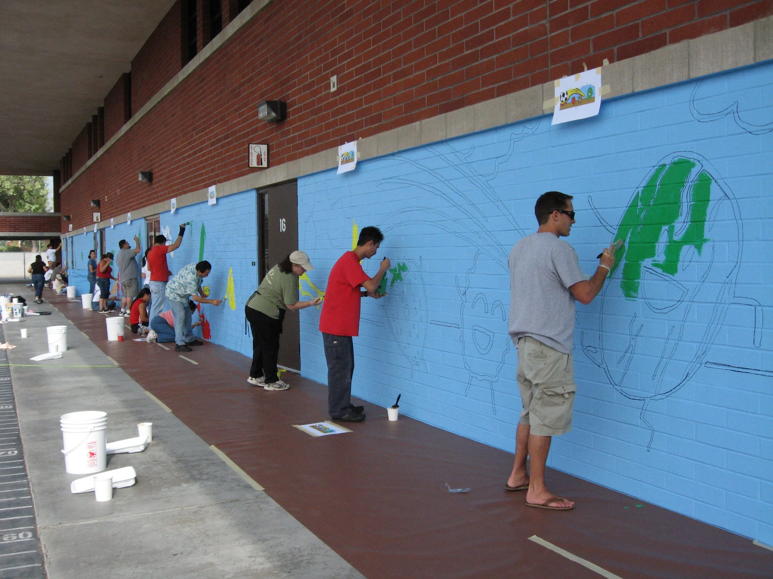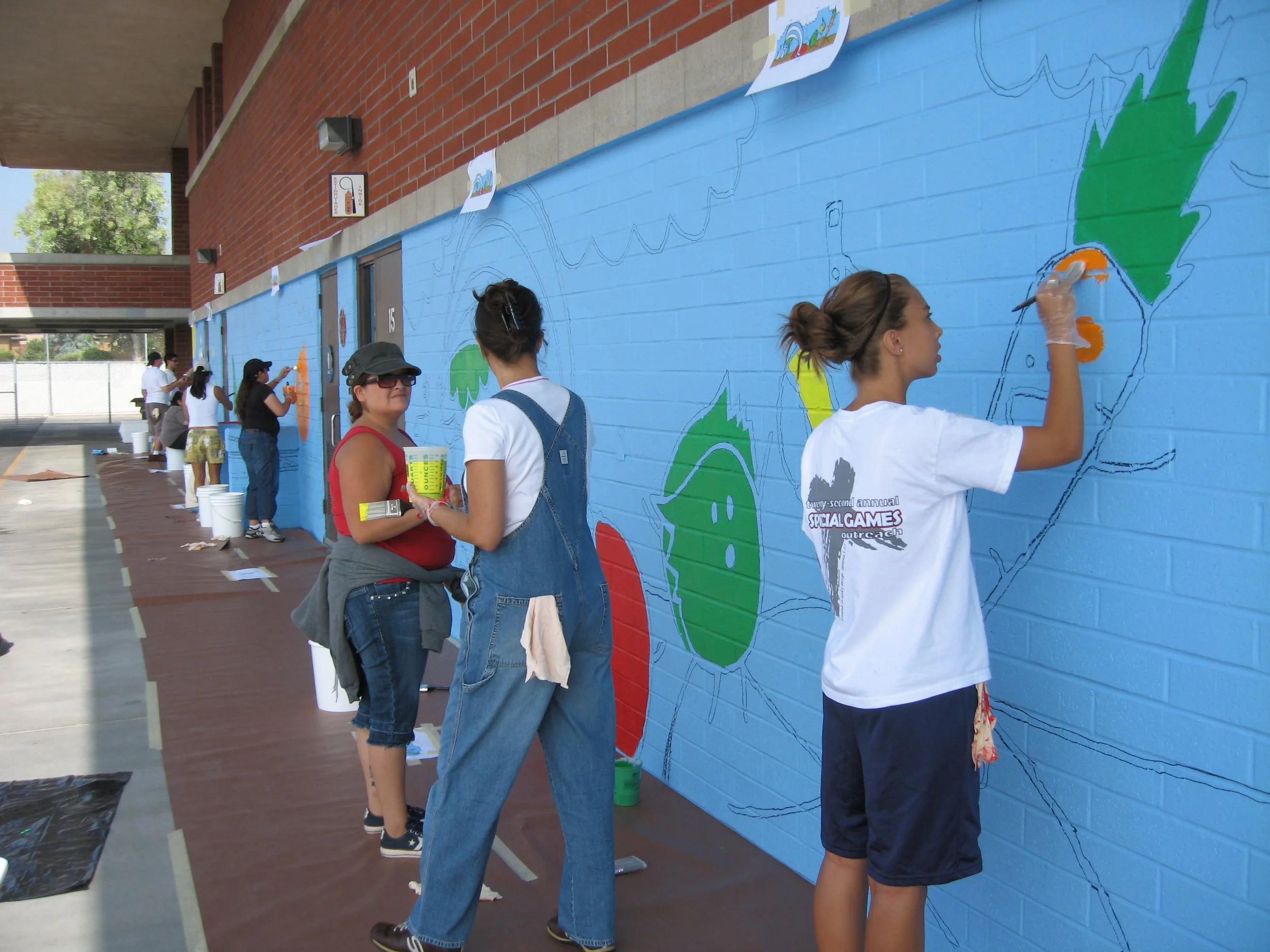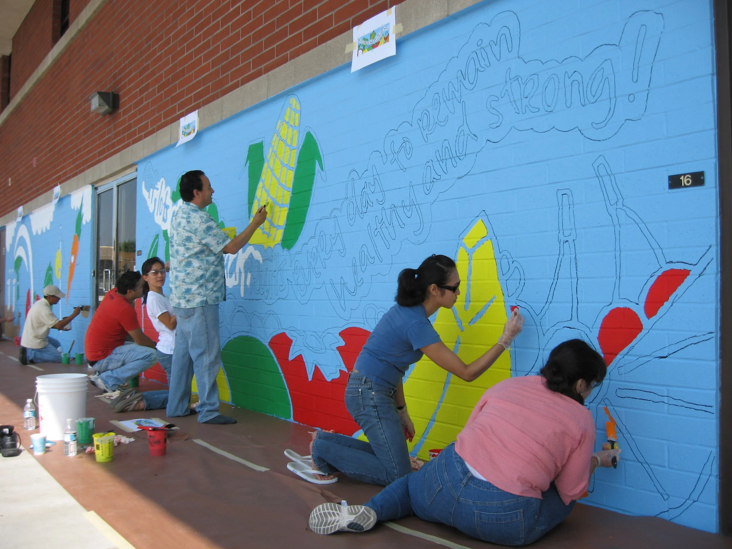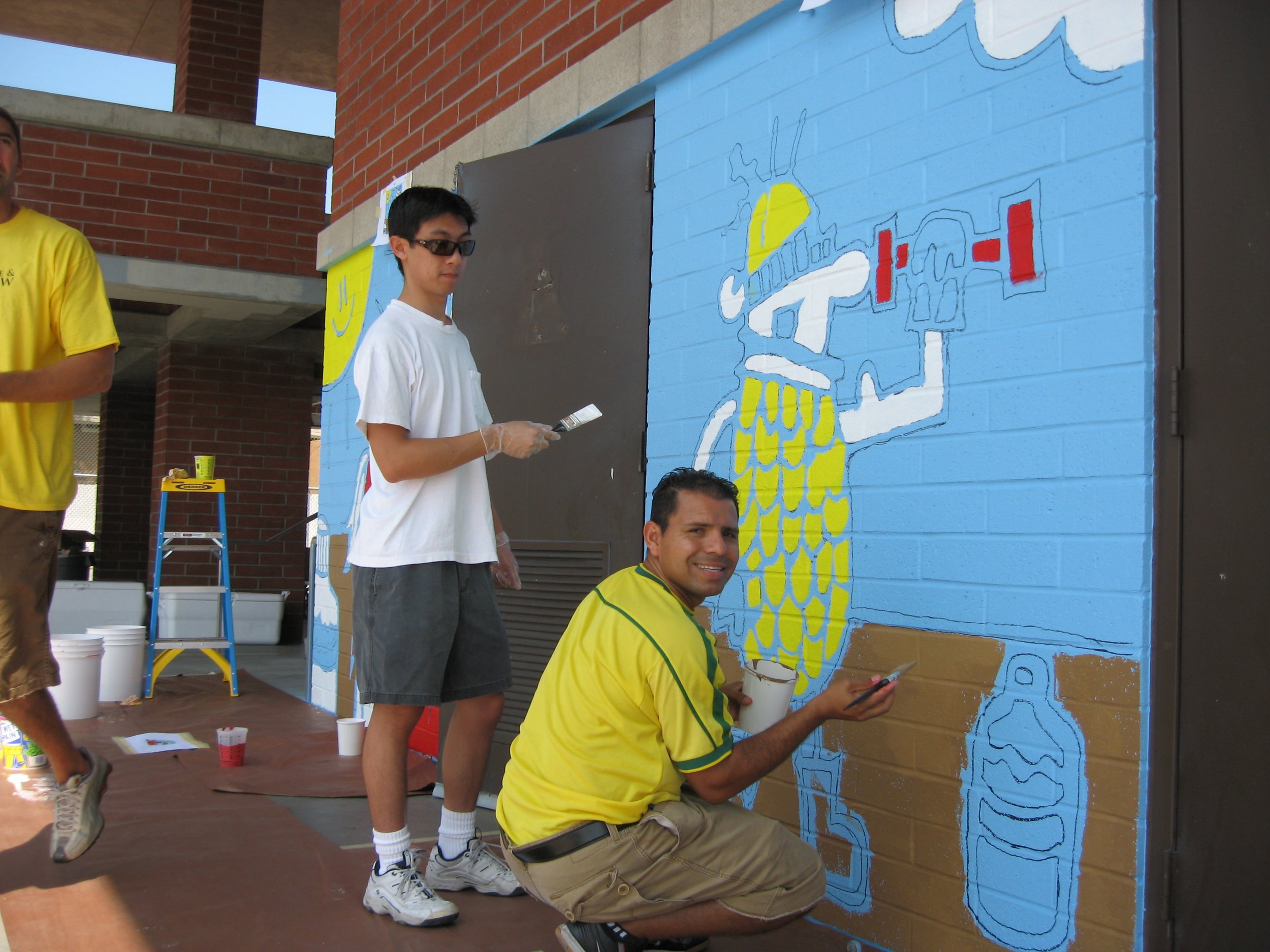 The walls surrounding the playground were plain brick, and the entire play area appeared very bleak. Give & Grow designed and painted a 170-foot mural on the entire back wall of the school building. The mural illustrates fruits and vegetables playing sports and being active. This is to promote a healthy lifestyle pivotal in combating childhood obesity. This mural not only provides color and vitality to the playground but addresses an important topic.