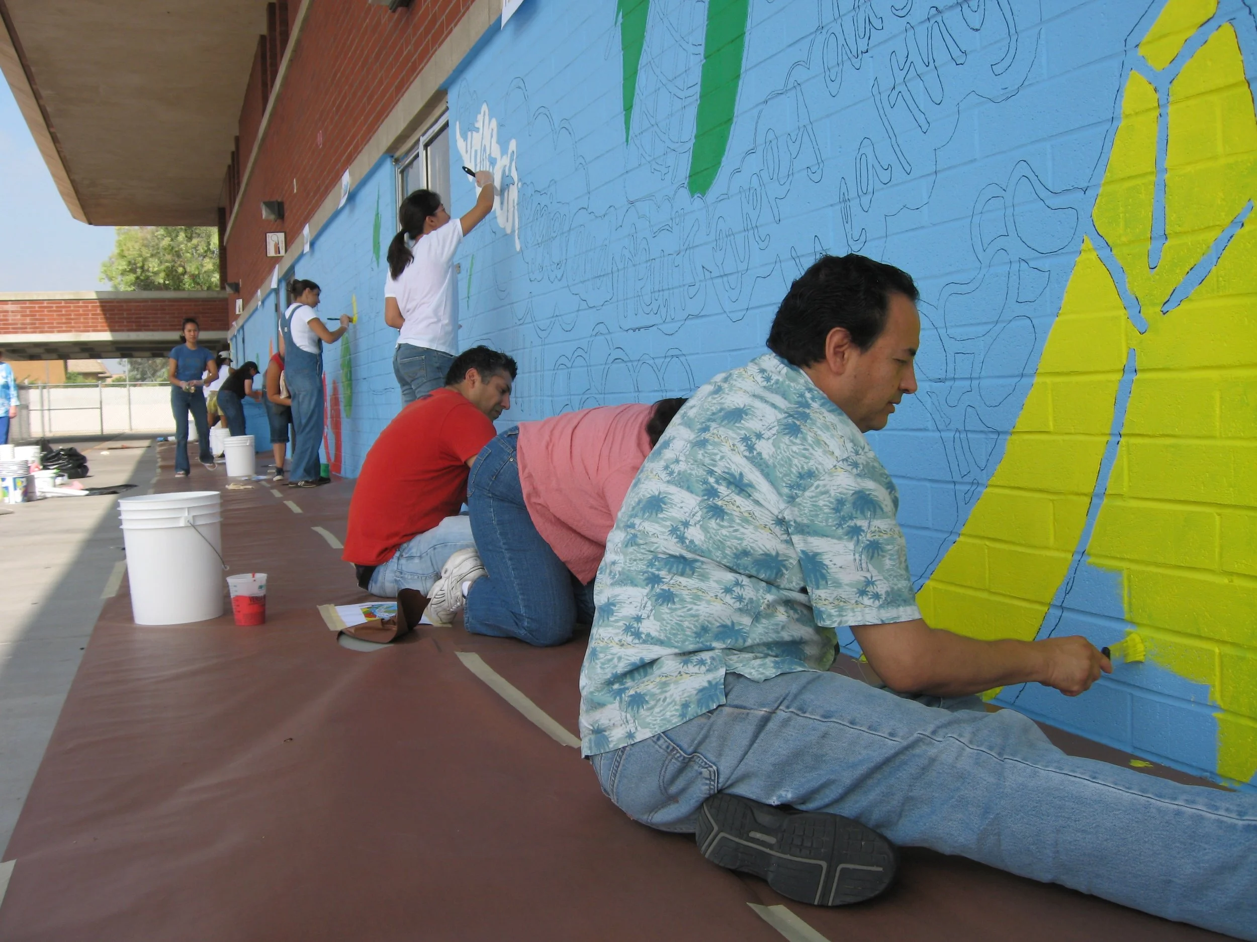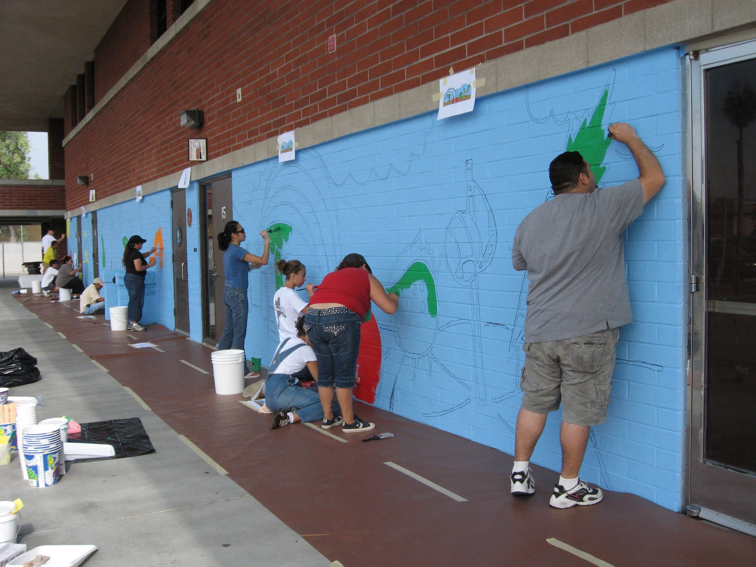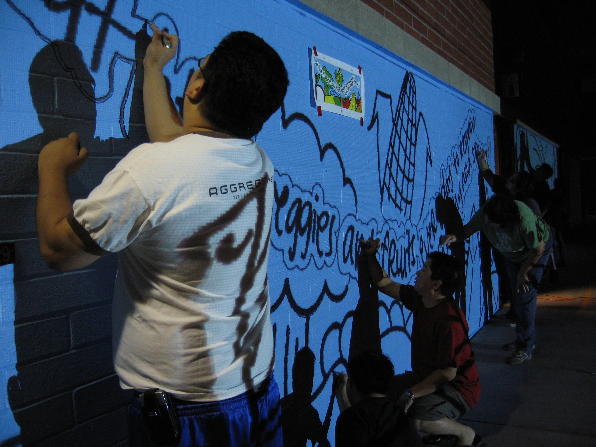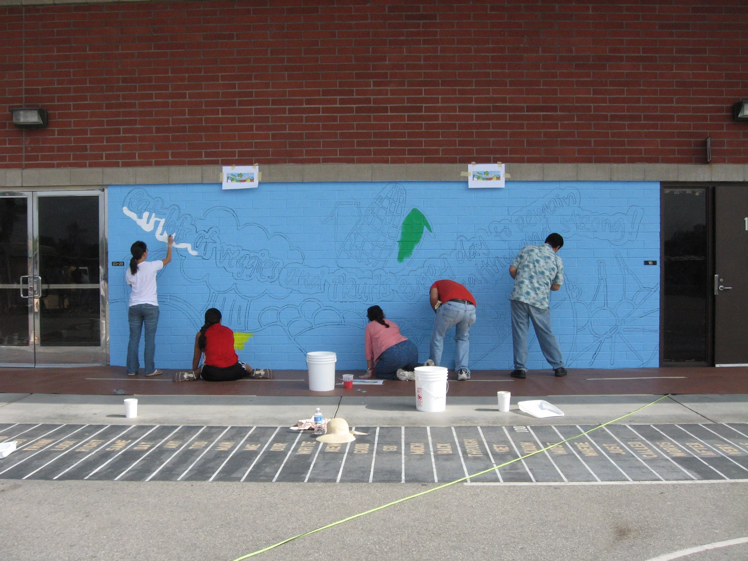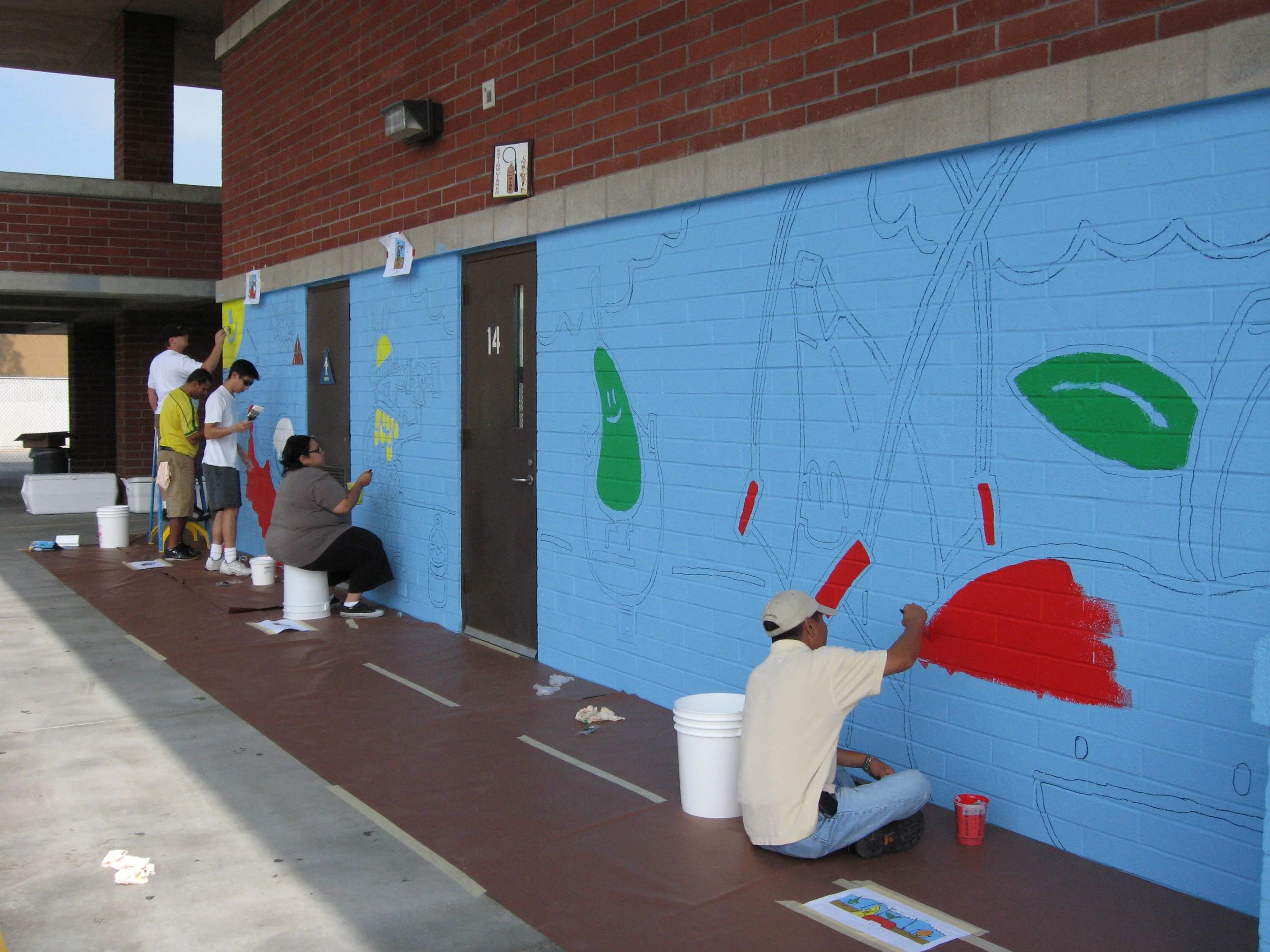 The walls surrounding the playground were plain brick, and the entire play area appeared very bleak. Give & Grow designed and painted a 170-foot mural on the entire back wall of the school building. The mural illustrates fruits and vegetables playing sports and being active. This is to promote a healthy lifestyle pivotal in combating childhood obesity. This mural not only provides color and vitality to the playground but addresses an important topic.
