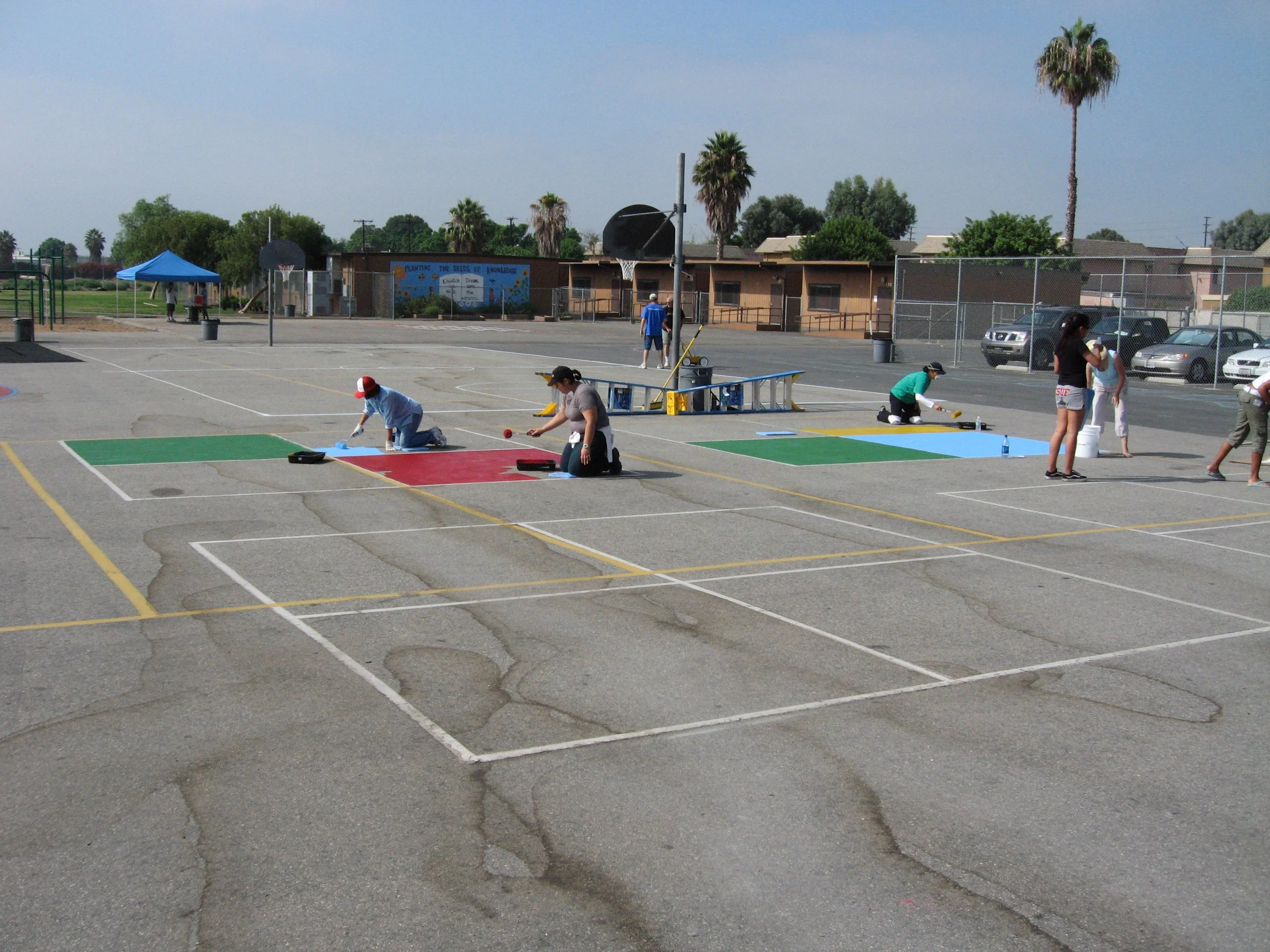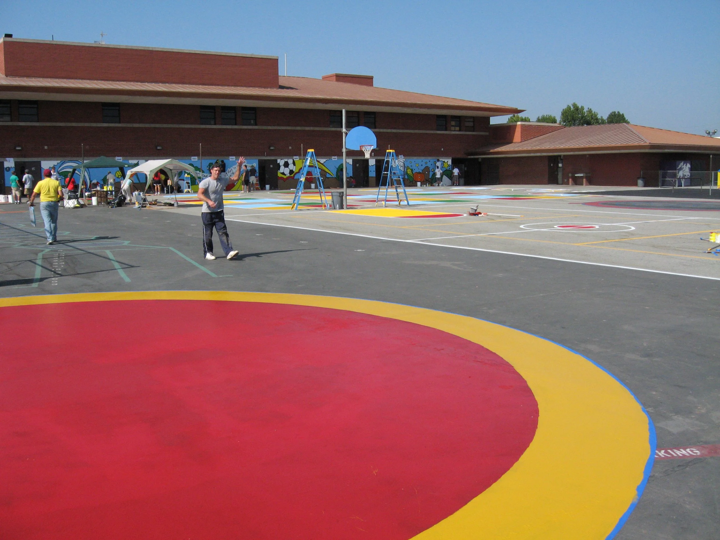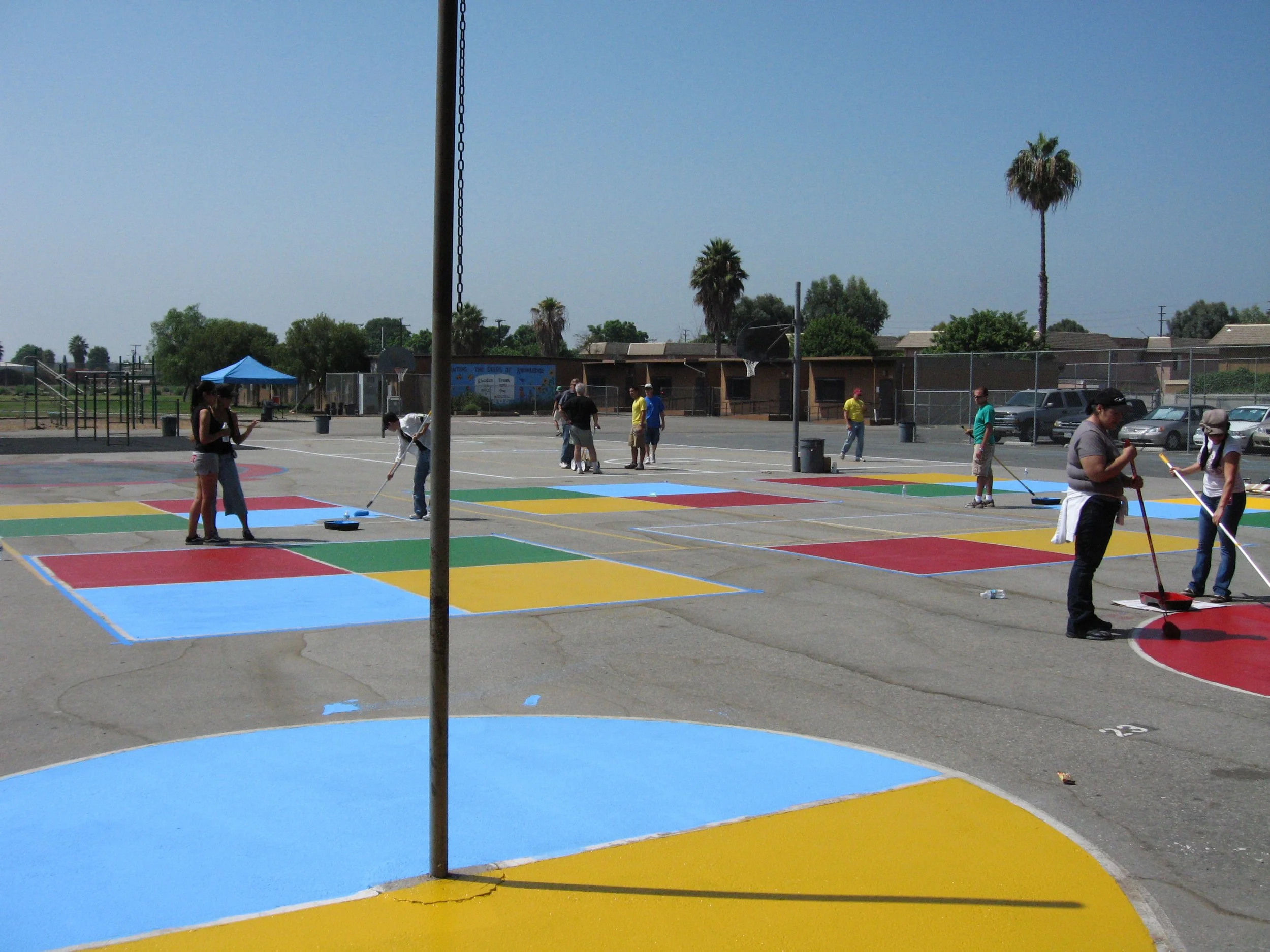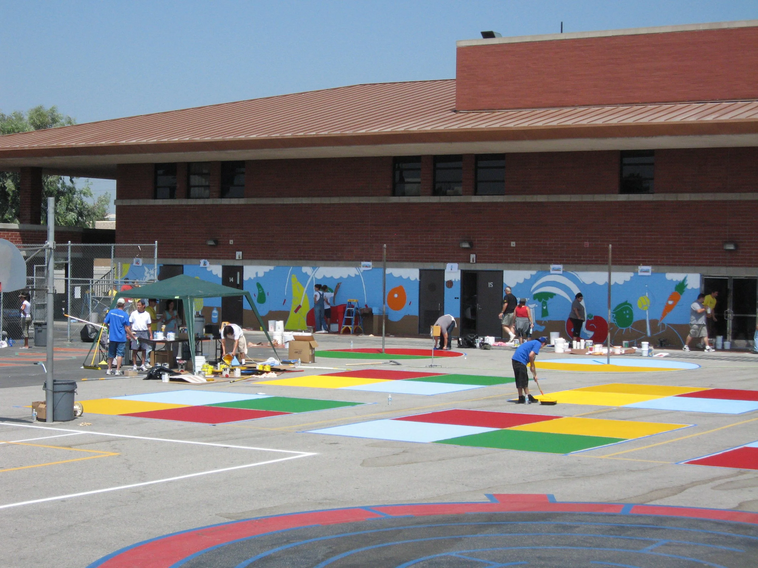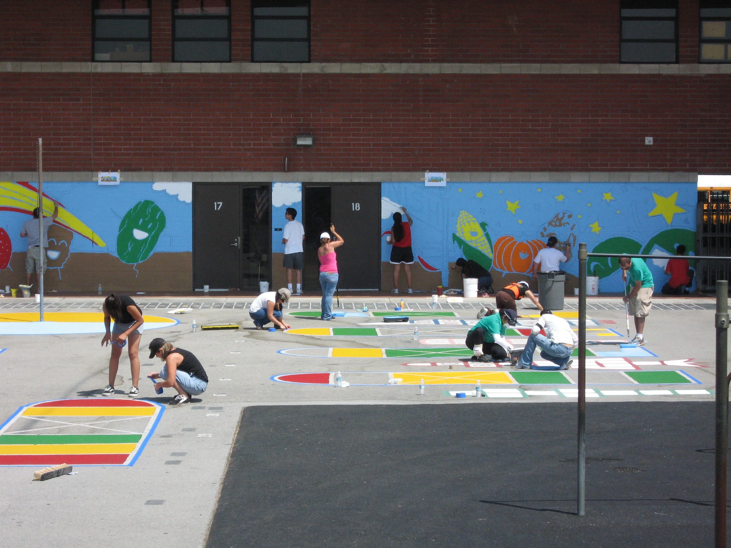 KES is an elementary school of over 800 students who regularly play games, such as “four square,” on the pavement. However, the games were colorless and lacked vitality. Give & Grow painted the “four square” grid, dodge ball boundaries, and other playground games in vibrant colors.