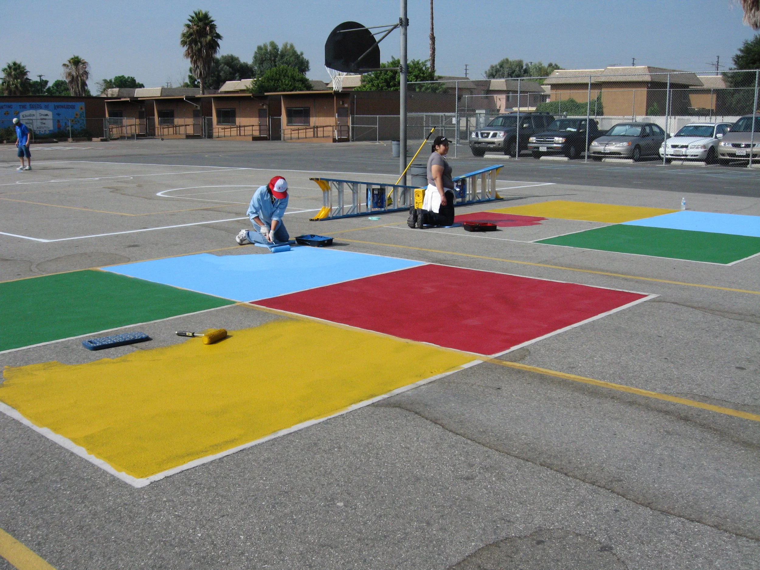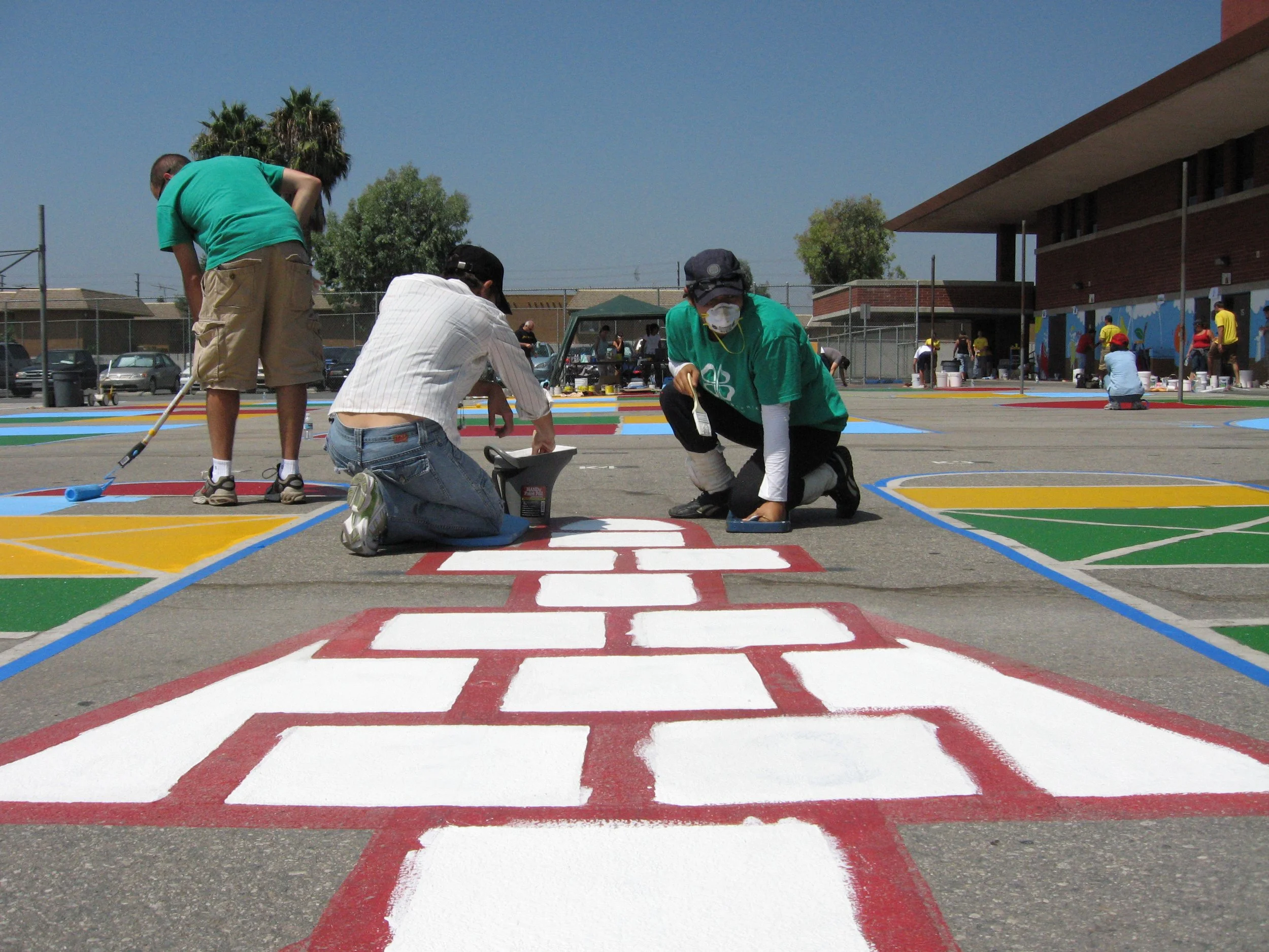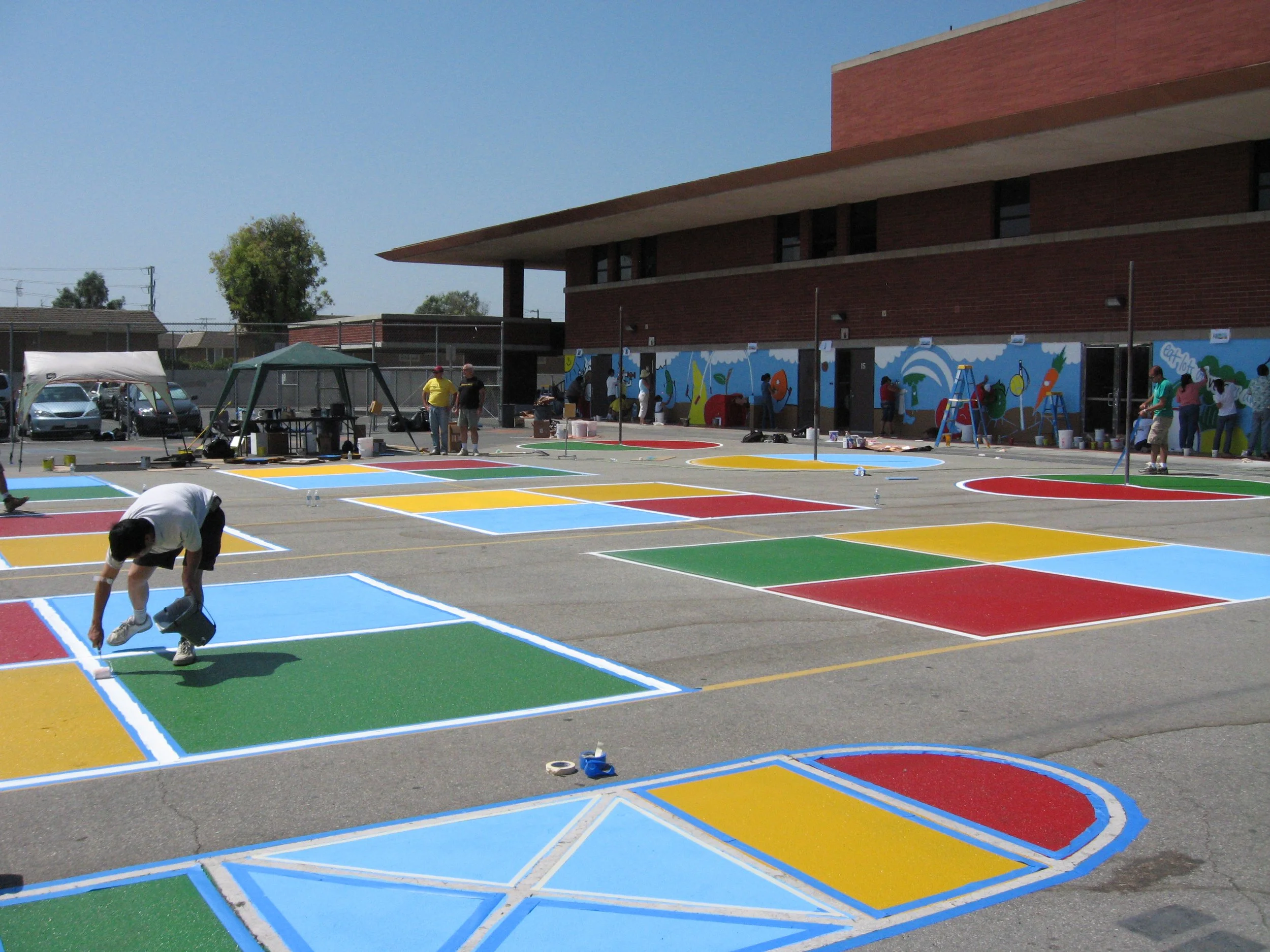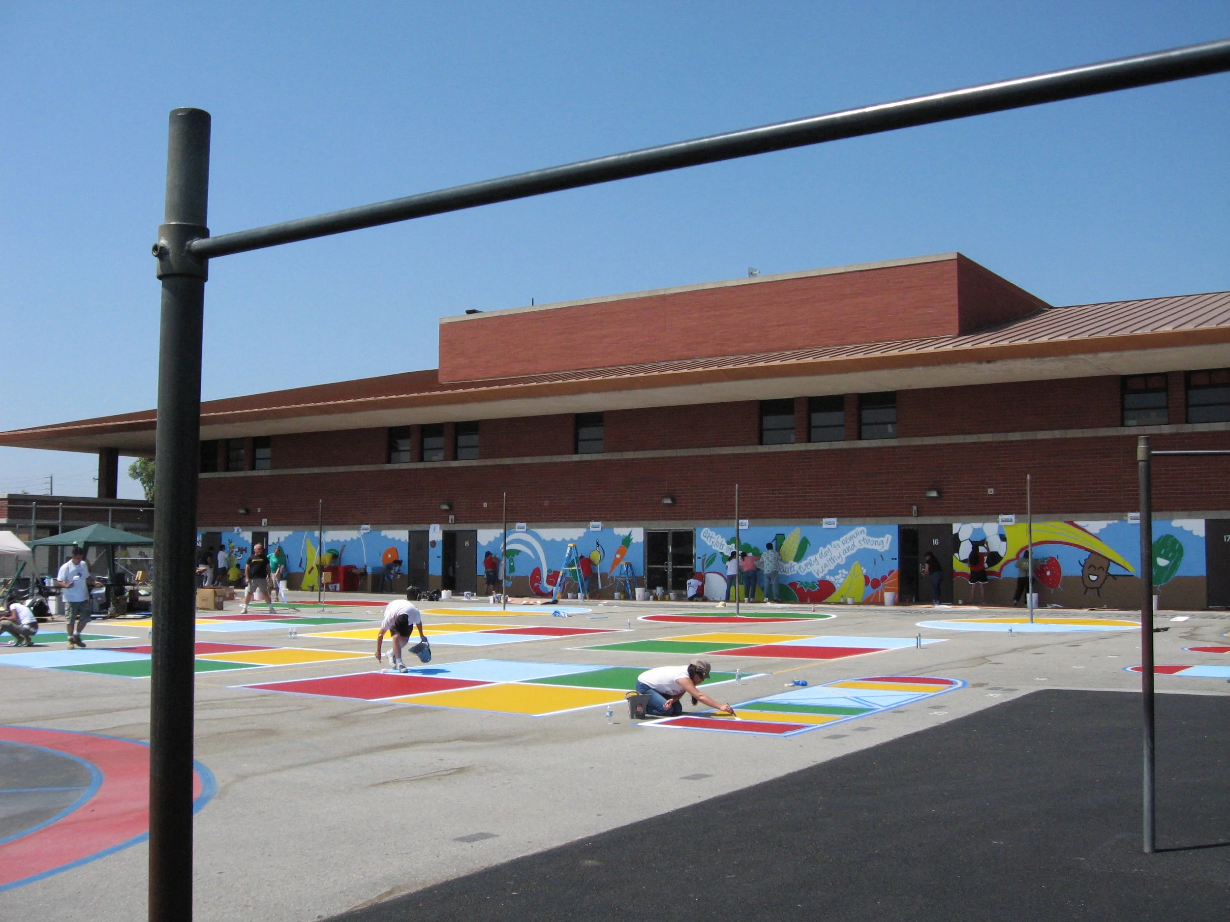 KES is an elementary school of over 800 students who regularly play games, such as “four square,” on the pavement. However, the games were colorless and lacked vitality. Give & Grow painted the “four square” grid, dodge ball boundaries, and other playground games in vibrant colors.