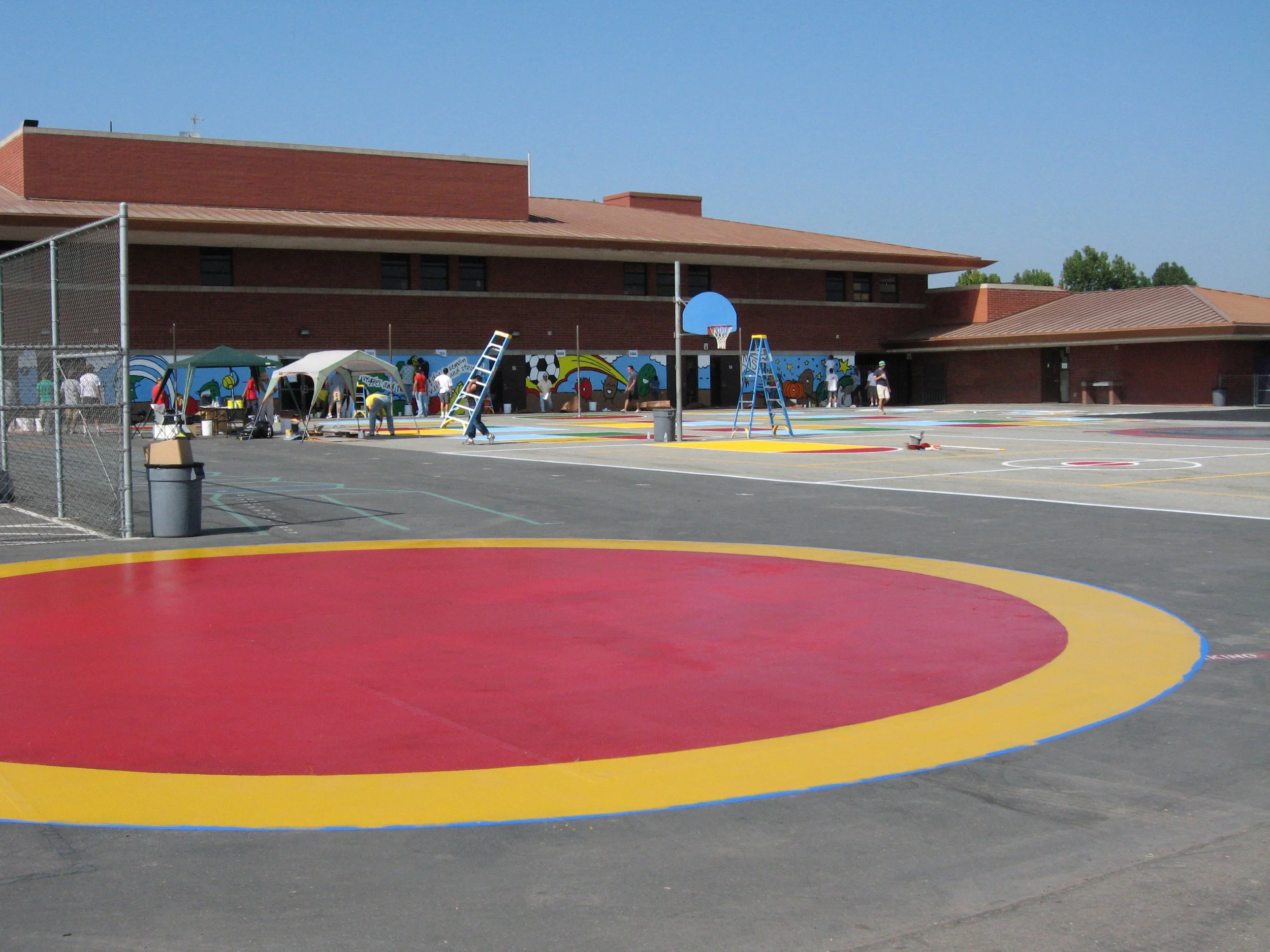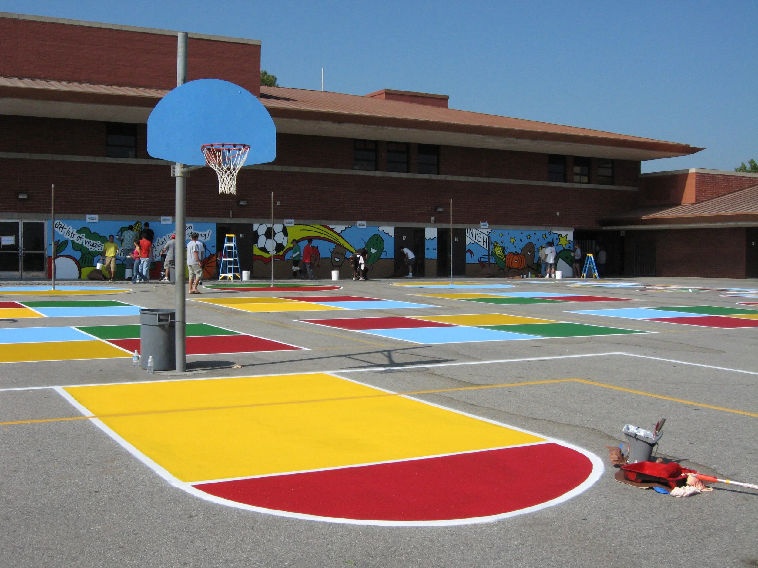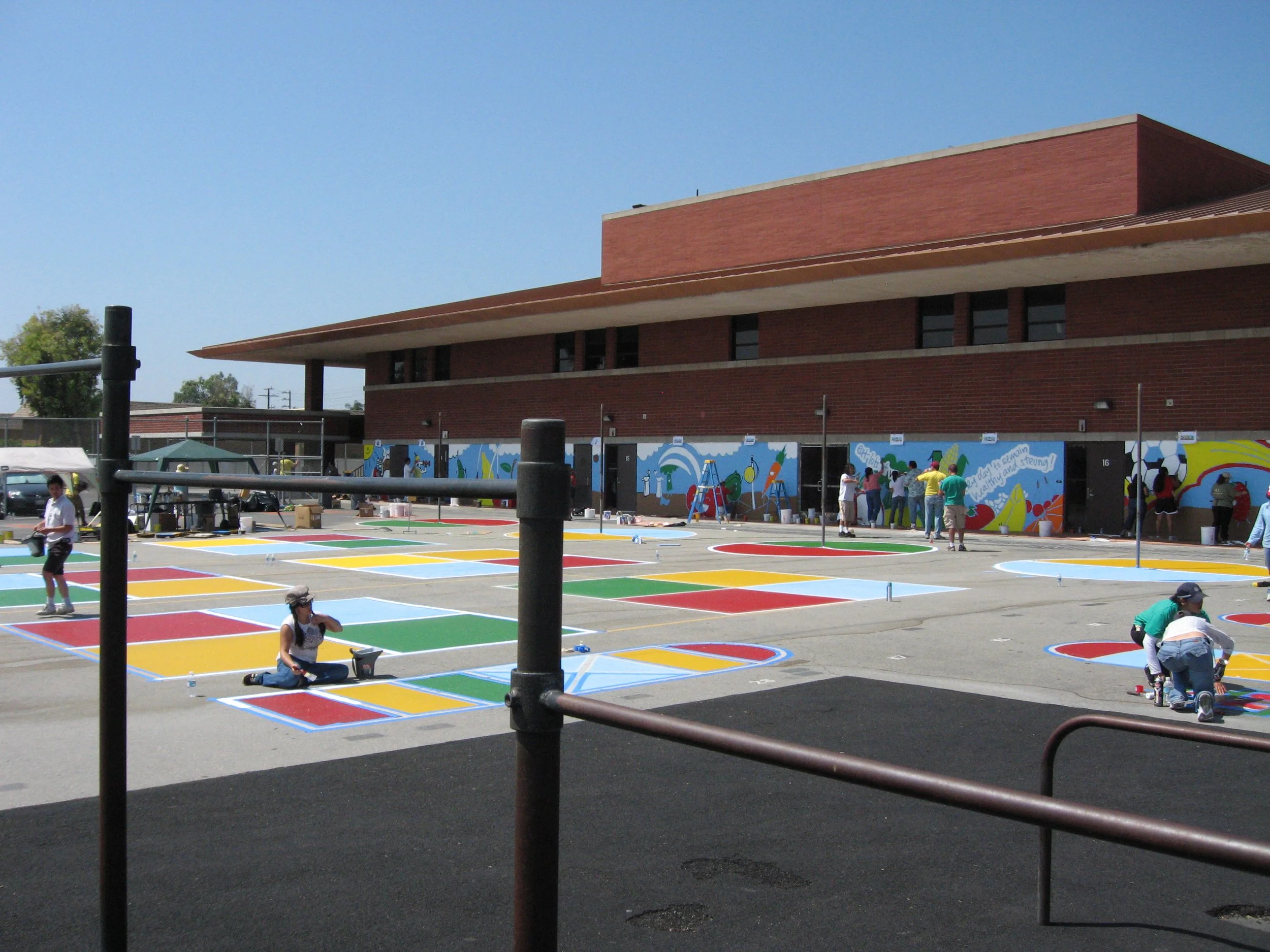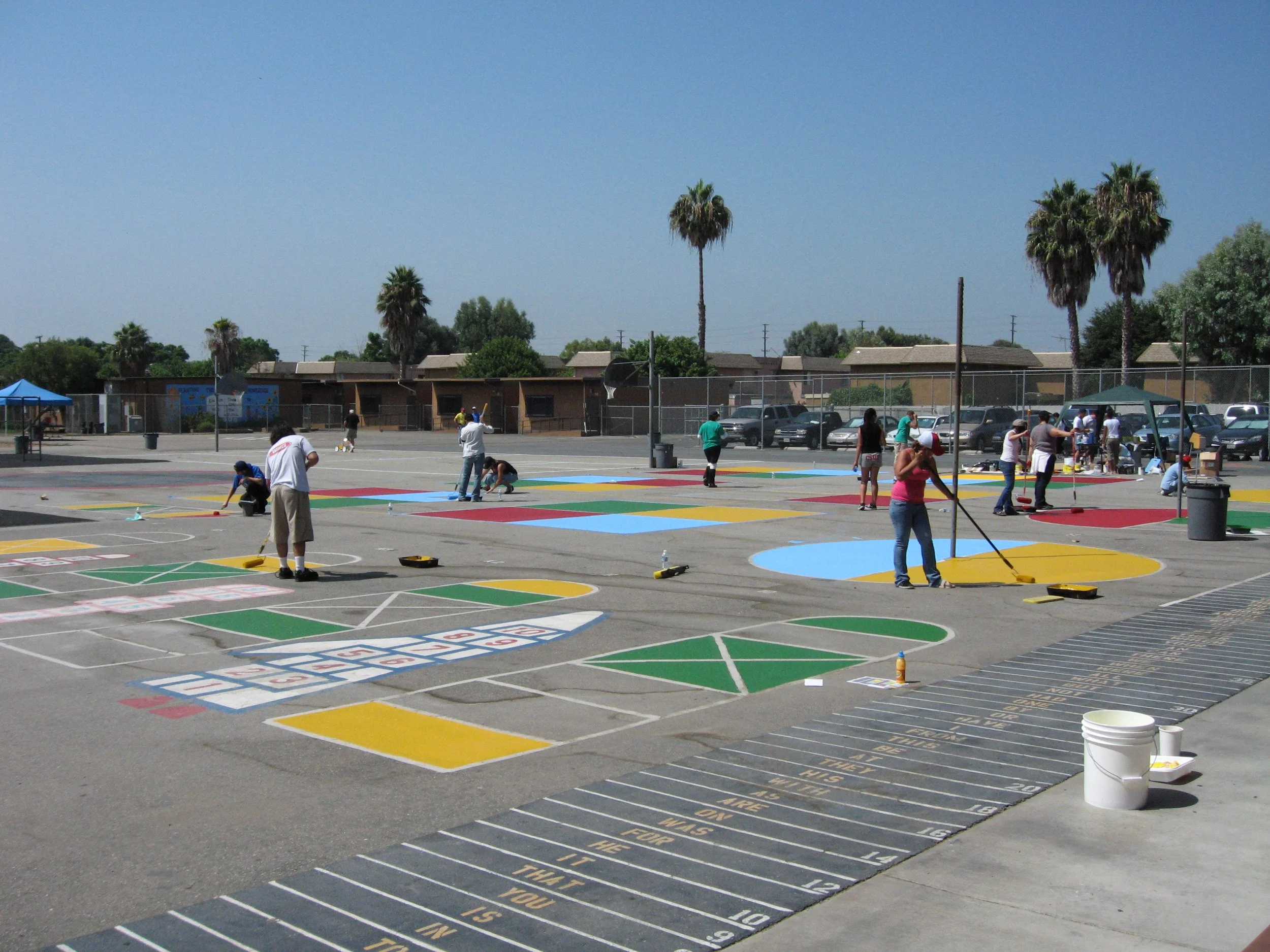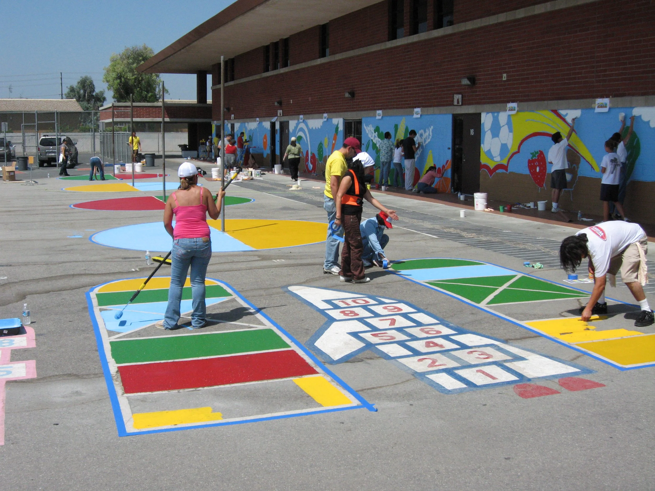 KES is an elementary school of over 800 students who regularly play games, such as “four square,” on the pavement. However, the games were colorless and lacked vitality. Give & Grow painted the “four square” grid, dodge ball boundaries, and other playground games in vibrant colors.