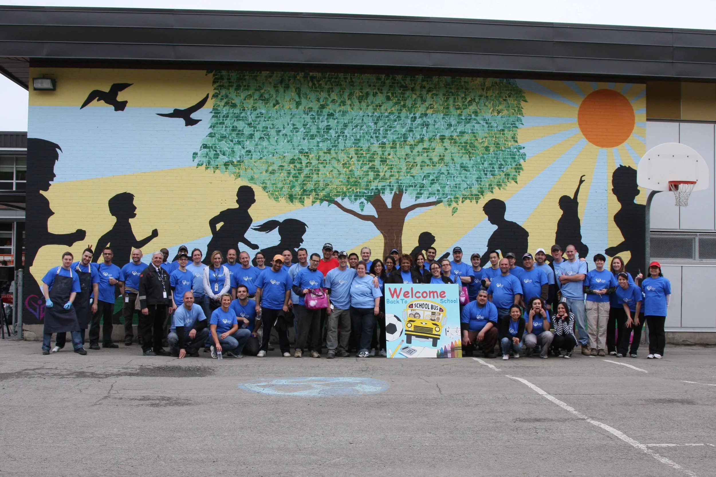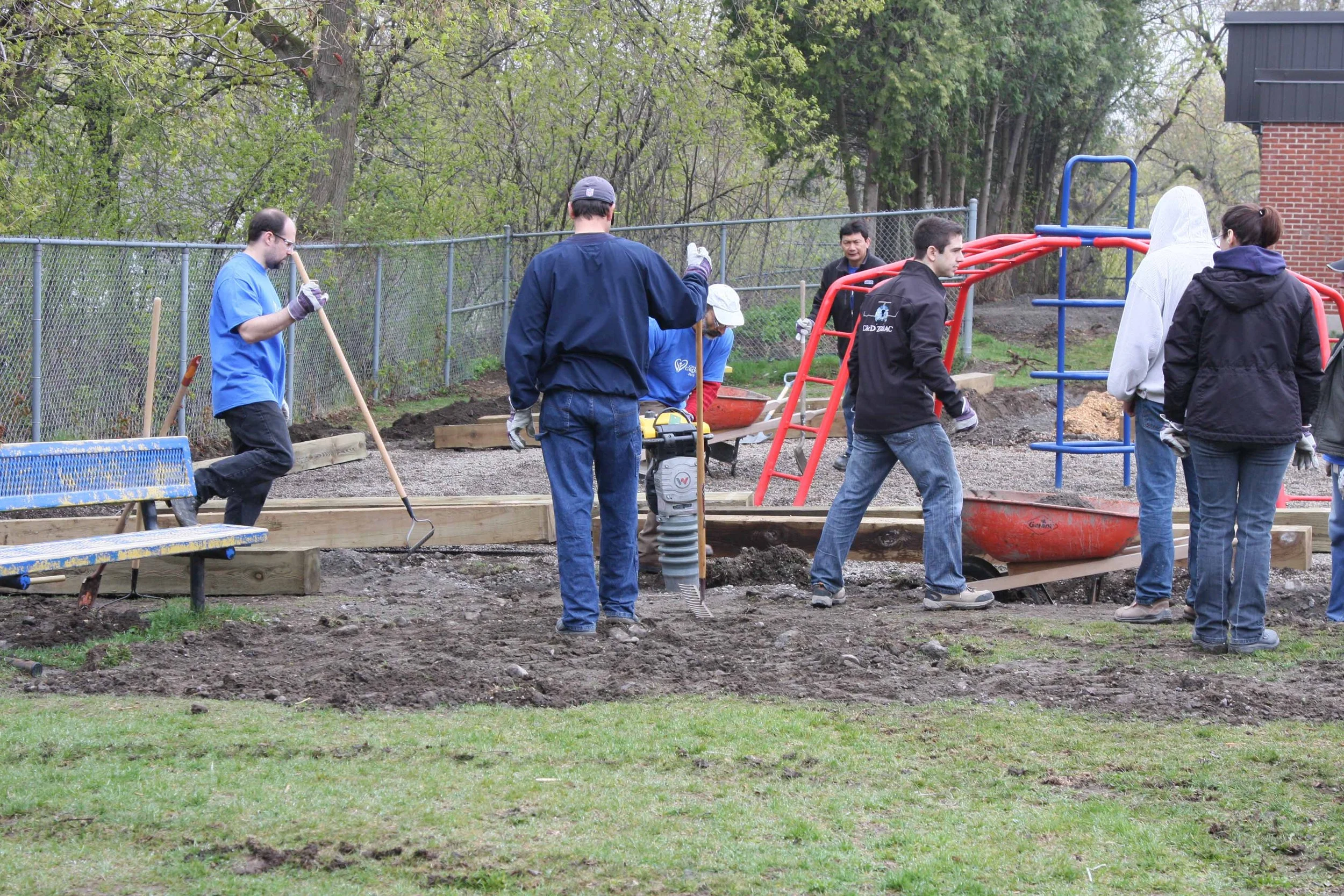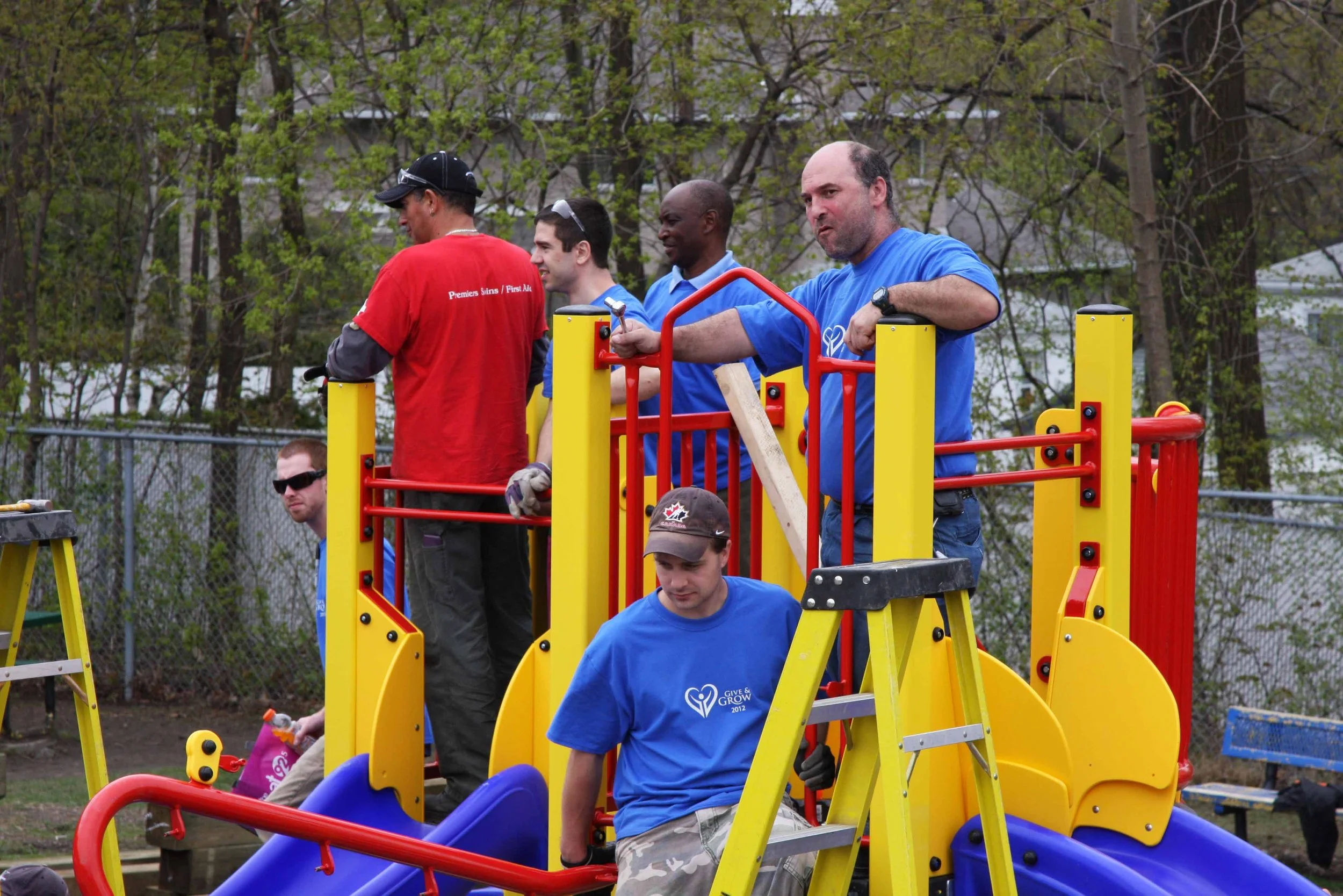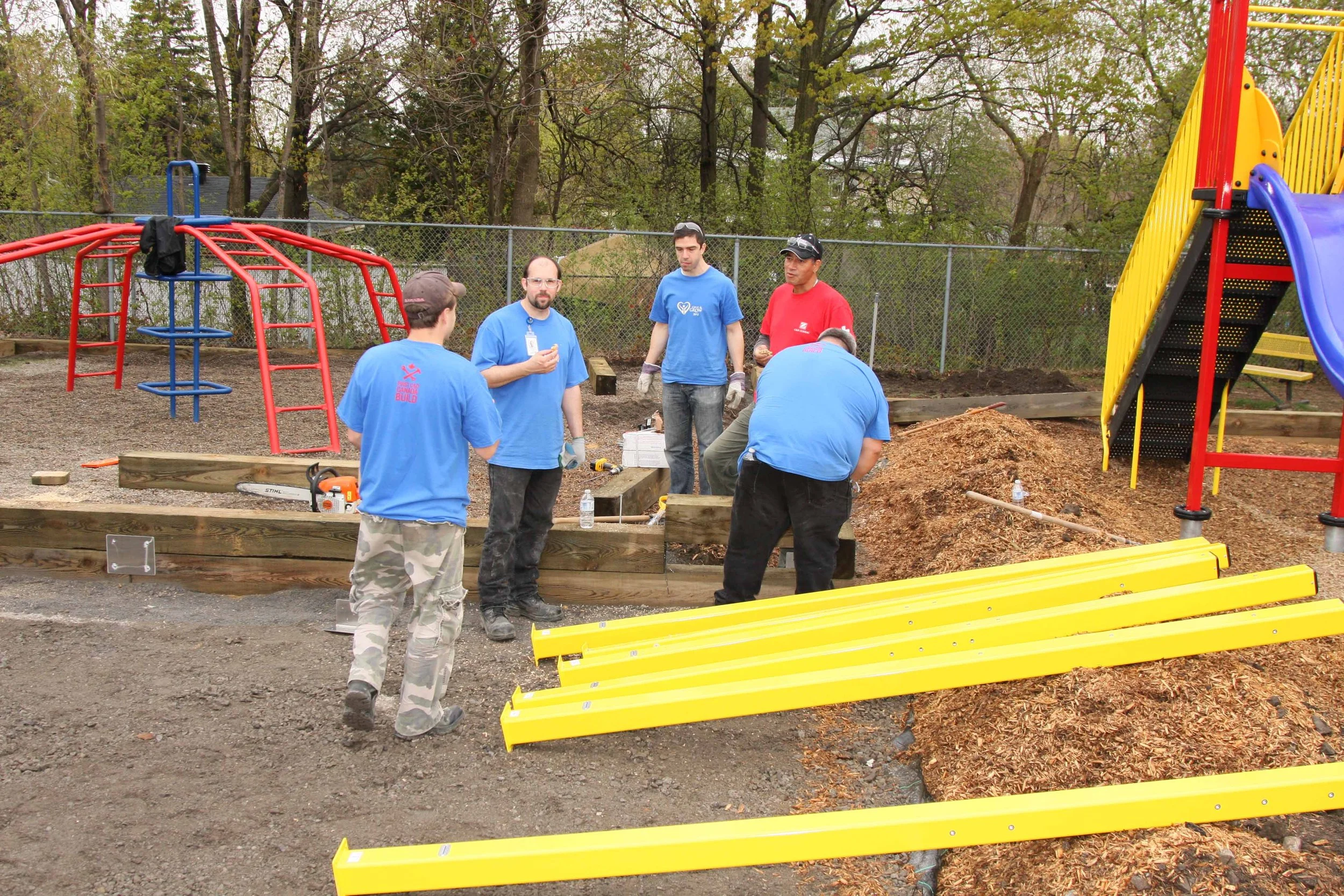 On May 3rd, 2012. 100 employees from C&D Zodiac in Montreal descended upon St Paul Elementary for the day for a schoolyard restoration. This is our first build in Montreal and we are proud of the hard work and dedication that all the employees gave on that day. In one day we were able to construct a playground, paint 2 murals, 12 boards (4ft by 4ft) which are for inside the school – themed – back to school – Halloween, Valentine – spring. Clean up all around the school yard. There were two large bins that were full to the top from all the branches and underbrush that we cleaned up.