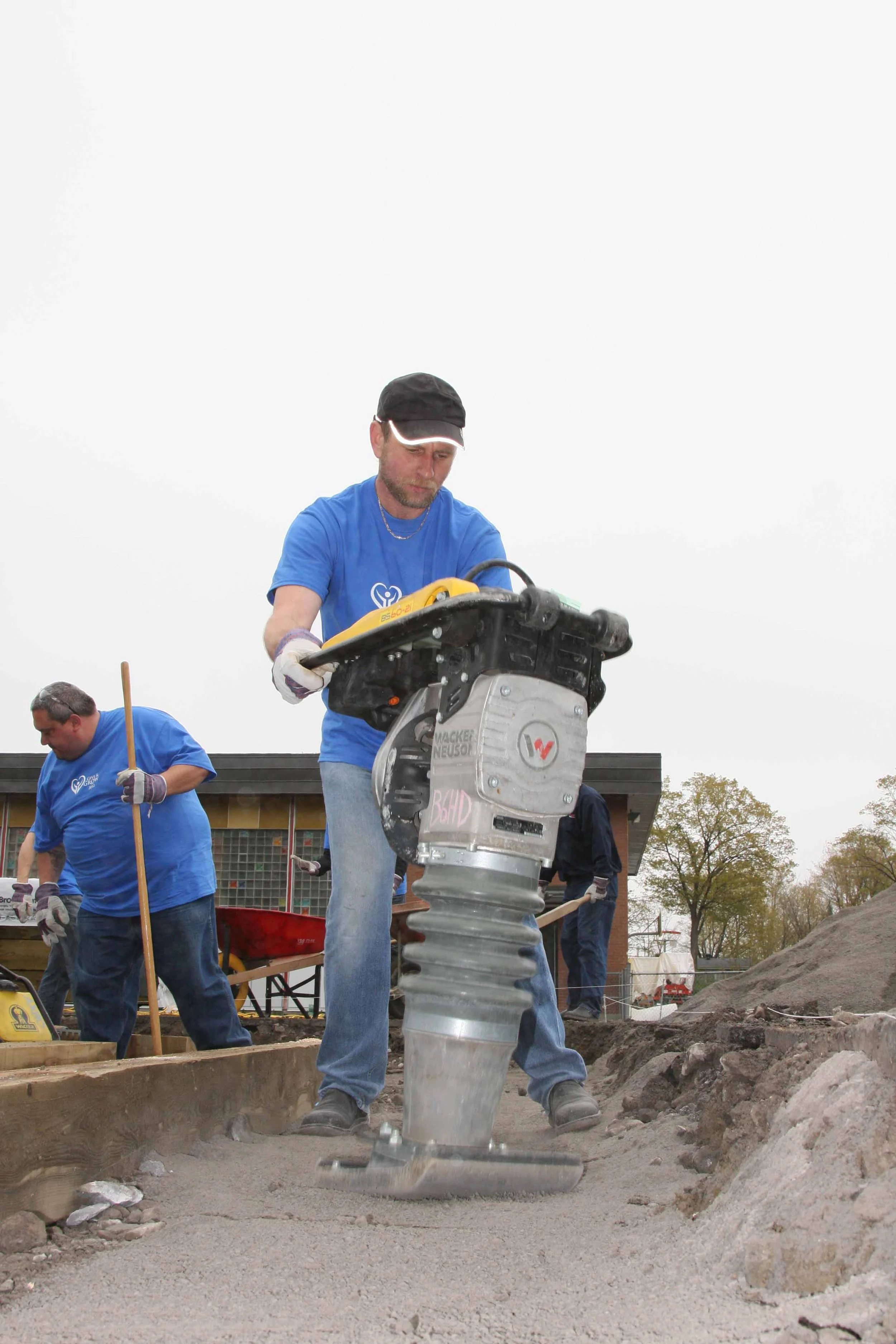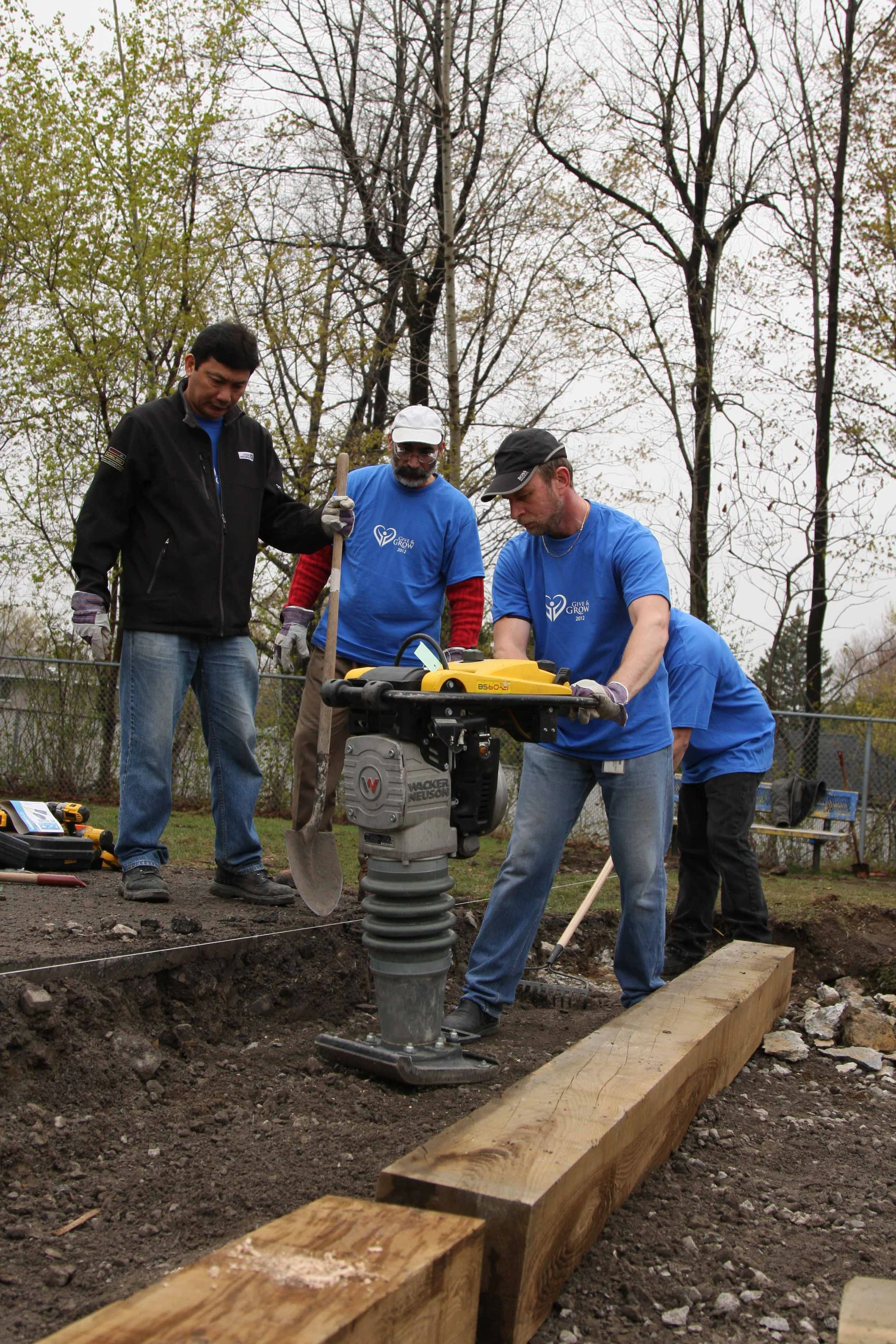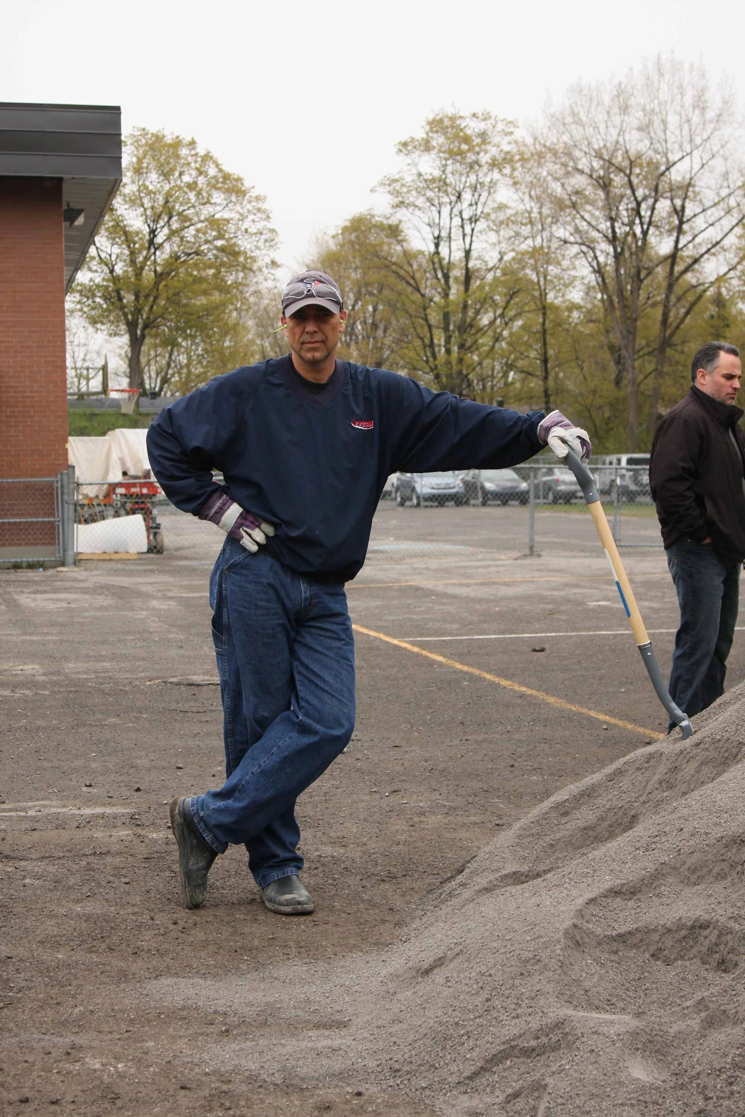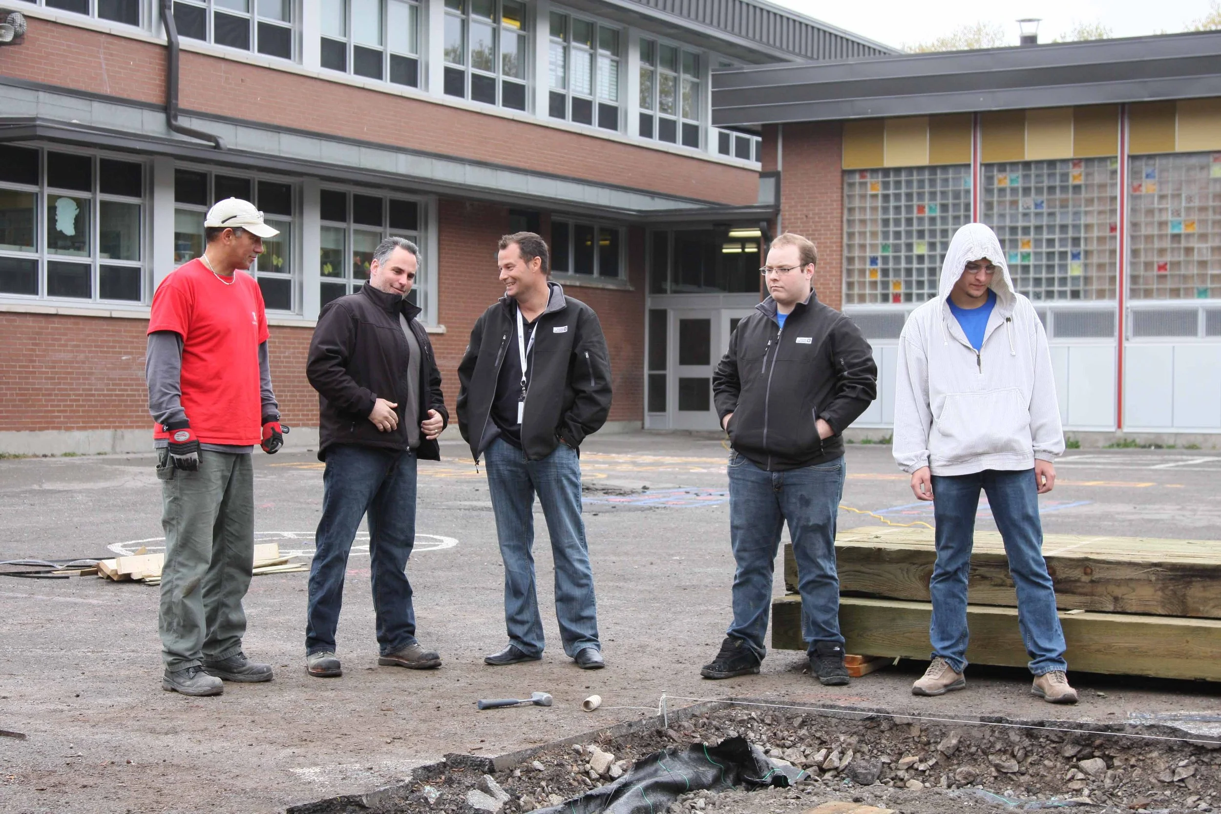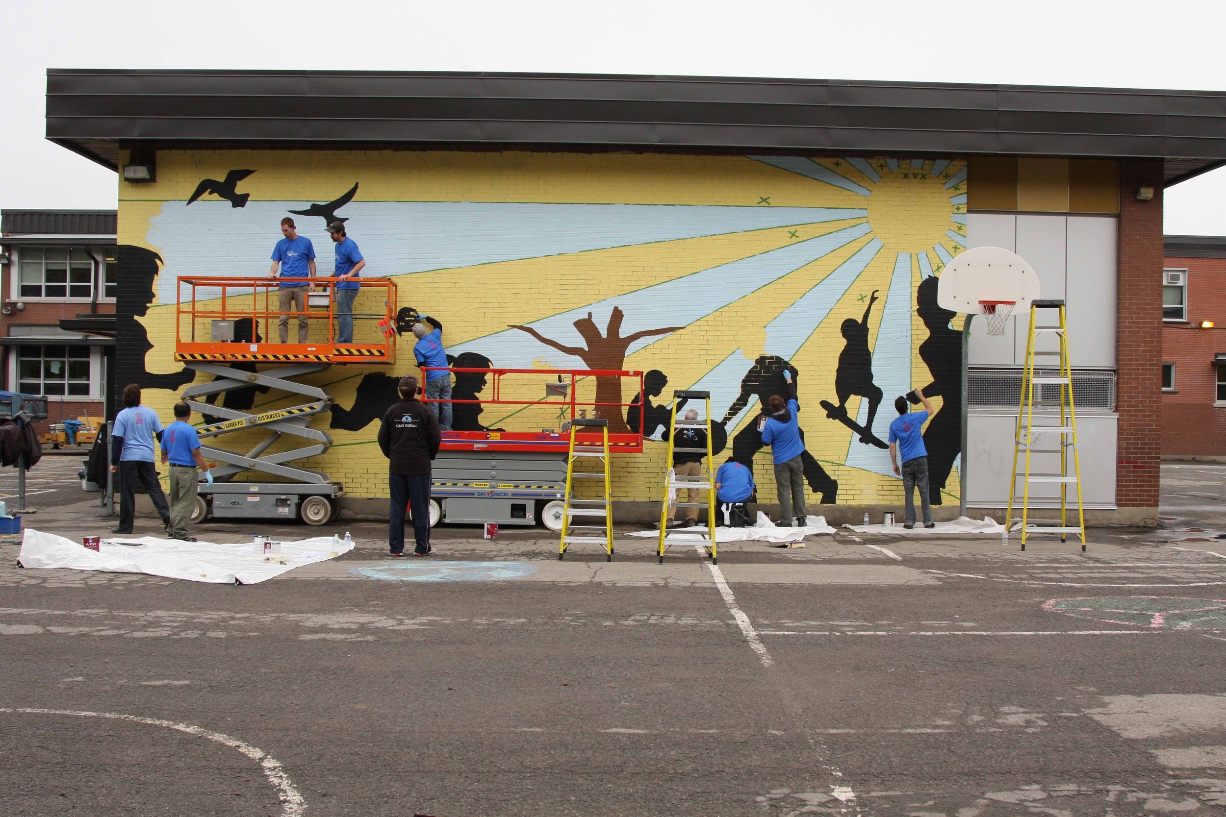 On May 3rd, 2012. 100 employees from C&D Zodiac in Montreal descended upon St Paul Elementary for the day for a schoolyard restoration. This is our first build in Montreal and we are proud of the hard work and dedication that all the employees gave on that day. In one day we were able to construct a playground, paint 2 murals, 12 boards (4ft by 4ft) which are for inside the school – themed – back to school – Halloween, Valentine – spring. Clean up all around the school yard. There were two large bins that were full to the top from all the branches and underbrush that we cleaned up.